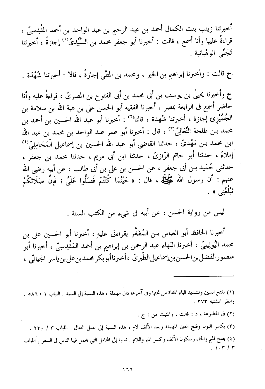 ح وَأخْبرنَا يحيى بن يُوسُف بن أبي مُحَمَّدِ بْنِ أَبِي الْفُتُوحِ بْنِ الْمِصْرِيِّ قِرَاءَةً عَلَيْهِ وَأَنَا حَاضِرٌ أَسْمَعُ فِي الرَّابِعَةِ بِمِصْرَ أَخْبَرَنَا الْفَقِيهِ أَبُو الْحَسَنِ عَلِيُّ بْنُ هِبَةِ اللَّهِ بْنِ سَلامَةَ بْنِ الْجميزيِّ إِجَازَةً أَخْبَرَتْنَا شُهْدَةُ قَالَتَا أَخْبَرَنَا أَبُو عَبْدِ اللَّهِ الْحُسَيْنُ بْنُ أَحْمَدَ بْنِ مُحَمَّدِ بْنِ طَلْحَةَ النِّعَالِيُّ قَالَ أَخْبَرَنَا أَبُو عُمَرَ عَبْدُ الْوَاحِدِ بْنُ مُحَمَّد بن عبد الله ابْن مُحَمَّدِ بْنِ مَهْدِيٍّ حَدَّثَنَا الْقَاضِي أَبُو عَبْدِ اللَّهِ الْحُسَيْنُ بْنُ إِسْمَاعِيلَ الْمَحَامِلِيُّ إِمْلاءً حَدَّثَنَا أَبُو حَاتِمٍ الرَّازِيُّ حَدَّثَنَا ابْنُ أَبِي مَرْيَمَ حَدَّثَنَا مُحَمَّدُ بْنُ جَعْفَرٍ حَدَّثَنِي حُمَيْدُ بْنُ أَبِي جَعْفَرٍ عَنِ الْحَسَنِ بْنِ عَلِيِّ بْنِ أَبِي طَالِبٍ عَنْ أَبِيهِ رَضِيَ اللَّهُ عَنْهُمْ أَن رَسُول الله صلى الله عَلَيْهِ وَسلم قَالَ حَيْثُمَا كُنْتُمْ فَصَلُّوا عَلِيَّ فَإِنَّ صَلاتَكُمْ تَبْلُغُنِي