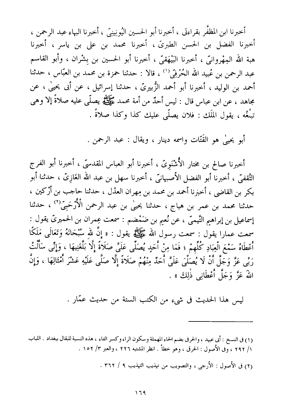 أخبرنَا صَالح بن مُخْتَار الأشنوي أَخْبَرَنَا أَبُو الْعَبَّاسِ الْمَقْدِسِيُّ أَخْبَرَنَا أَبُو الْفَرَجِ الثَّقَفِيُّ أَخْبَرَنَا أَبُو الْفَضْلِ الأَصْبَهَانِيُّ أَخْبَرَنَا سَهْلُ بْنُ عَبْدِ اللَّهِ الْغَازِي حَدَّثَنَا أَبُو بَكْرِ بْنُ الْقَاضِي أَخْبَرَنَا أَحْمَدُ بْنُ مُحَمَّدِ بْنِ مِهْرَانَ الْعَدْلُ حَدَّثَنَا حَاجِبُ بْنُ أَرْكِينَ حَدَّثَنَا مُحَمَّدُ بْنُ عُمَرَ بْنِ هَيَّاجٍ حَدَّثَنَا يَحْيَى بْنُ عَبْدِ الرَّحْمَنِ الأَرْحَبِيُّ حَدَّثَنَا إِسْمَاعِيلُ بْنُ إِبْرَاهِيمَ التَّيْمِيُّ عَنْ نُعَيْمِ بْنِ ضَمْضَمٍ سَمِعْتُ عِمْرَانَ بْنَ الْحِمْيَرِيِّ يَقُولُ سَمِعْتُ عَمَّارًا يَقُولُ سَمِعت رَسُول الله صلى الله عَلَيْهِ وَسلم يَقُولُ إِنَّ للَّهِ سُبْحَانَهُ وَتَعَالَى مَلَكًا أَعْطَاهُ سَمْعَ الْعِبَادِ كُلِّهِمْ فَمَا مِنْ أَحَدٍ يُصَلِّي عَلَيَّ صَلاةً إِلا بَلَّغَنِيهَا وَإِنِّي سَأَلْتُ رَبِّي عَزَّ وَجَلَّ أَنْ لَا يُصَلِّيَ عَلَيَّ أَحَدٌ مِنْهُمُ صَلاةً إِلا صَلَّى عَلَيْهِ عَشْرَ أَمْثَالِهَا وَإِنَّ اللَّهَ عَزَّ وَجَلَّ أَعْطَانِي ذَلِكَ