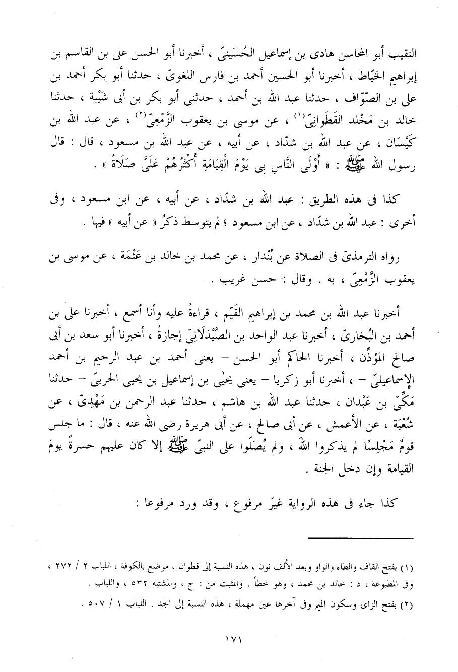 النَّقِيبُ أَبُو الْمَحَاسِنِ هَادِي بْنُ إِسْمَاعِيلَ الْحُسَيْنِيُّ أَخْبَرَنَا أَبُو الْحَسَنِ عَلِيُّ بْنُ الْقَاسِمِ بْنِ إِبْرَاهِيمَ الْخَيَّاطُ أَخْبَرَنَا أَبُو الْحُسَيْنِ أَحْمَدُ بْنُ فَارِسٍ اللُّغَوِيُّ حَدَّثَنَا أَبُو بَكْرٍ أَحْمَدُ بْنُ عَلِيِّ بْنِ الصَّوَّافِ حَدَّثَنَا عَبْدُ اللَّهِ بْنُ أَحْمَدَ حَدَّثَنِي أَبُو بَكْرِ بْنُ أَبِي شَيْبَةَ حَدَّثَنَا خَالِدُ بْنُ مَخْلَدٍ الْقَطَوَانِيُّ عَنْ مُوسَى بْنِ يَعْقُوبَ الزَّمْعِيِّ عَنْ عَبْدِ اللَّهِ بْنِ كَيْسَانَ عَنْ عَبْدِ اللَّهِ بْنِ شَدَّادٍ عَنْ أَبِيهِ عَن عَبْدِ اللَّهِ بْنِ مَسْعُودٍ قَالَ قَالَ رَسُول الله صلى الله عَلَيْهِ وَسلم أَوْلَى النَّاسِ بِي يَوْمَ الْقِيَامَةِ أَكْثَرُهُمْ عَلِيَّ صَلاةً