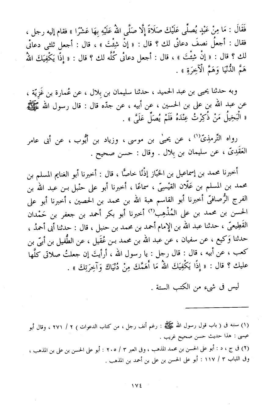 أَخْبَرَنَا مُحَمَّدُ بْنُ إِسْمَاعِيلَ بْنِ الْخَبَّازِ إِذْنًا خَاصًّا قَالَ أَخْبَرَنَا أَبُو الْغَنَايِمِ الْمُسْلِمُ بْنُ مُحَمَّدِ بْنِ الْمُسْلِمِ بْنِ عَلانَ الْقَيْسِيُّ سَمَاعًا أَخْبَرَنَا أَبُو عَلِيٍّ حَنْبَلُ بْنُ عَبْدِ اللَّهِ بْنِ الْفَرَجِ الرُّصَافِيُّ أَخْبَرَنَا أَبُو الْقَاسِمِ هِبَةُ اللَّهِ بْنُ مُحَمَّدِ بْنِ الْحُصَيْنِ أَخْبَرَنَا أَبُو عَلِيٍّ الْحَسَنُ بْنُ مُحَمَّدِ بْنِ عَلِيٍّ الْمُذْهِبُ أَخْبَرَنَا أَبُو بَكْرٍ أَحْمَدُ بْنُ جَعْفَرِ بْنِ حَمْدَانَ الْقِطيِعِيُّ حَدَّثَنَا عَبْدُ اللَّهِ بْنُ الإِمَامِ أَحْمَدَ بْنِ مُحَمَّدِ بْنِ حَنْبَلٍ قَالَ حَدَّثَنَا أَبِي أَحْمَدُ حَدَّثَنَا وَكِيعٌ عَنْ سُفْيَانَ عَنْ عَبْدِ اللَّهِ بْنِ مُحَمَّدِ بْنِ عَقِيلٍ عَنِ الطُّفَيْلِ بْنِ أُبَيِّ بْنِ كَعْبٍ عَنْ أَبِيهِ قَالَ قَالَ رَجُلٌ يَا رَسُولَ اللَّهِ أَرَأَيْتَ إِنْ جَعَلْتُ صَلاتِي كُلَّهَا عَلَيْكَ قَالَ إِذًا يَكْفِيكَ اللَّهُ مَا أَهَمَّكَ مِنْ دُنْيَاكَ وَآخِرَتِكَ