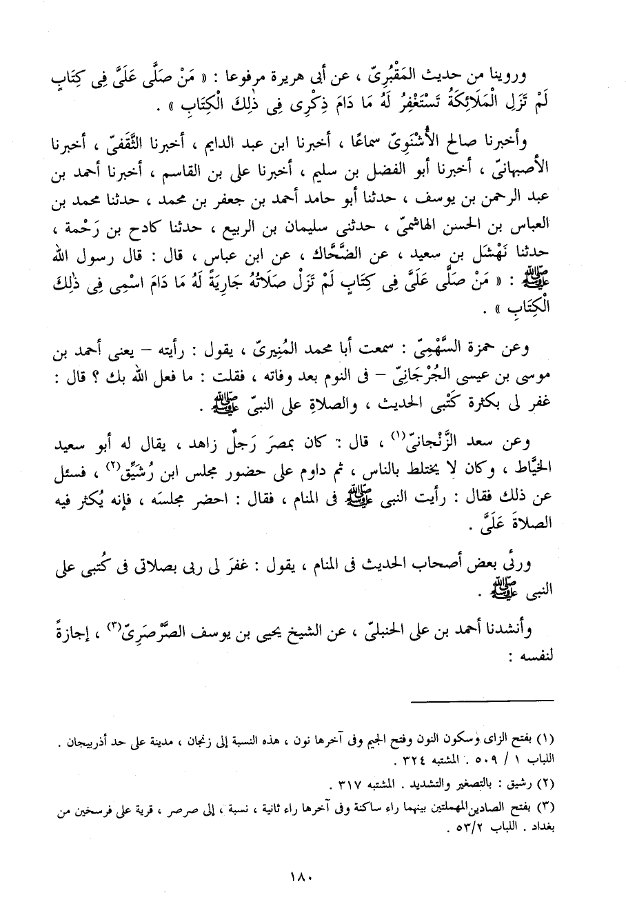 وَأخْبرنَا صَالح الأشنوي سَمَاعًا أَخْبَرَنَا ابْنُ عَبْدِ الدَّايِمِ أَخْبَرَنَا الثَّقَفِيُّ أَخْبَرَنَا الأَصْبَهَانِيُّ أَخْبَرَنَا أَبُو الْفَضْلِ بْنُ سُلَيْمٍ أَخْبَرَنَا عَلِيُّ بْنُ الْقَاسِمِ أَخْبَرَنَا أَحْمَدُ بْنُ عَبْدِ الرَّحْمَنِ بْنِ يُوسُفَ حَدَّثَنَا أَبُو حَامِدٍ أَحْمَدُ بْنُ جَعْفَرِ بْنِ مُحَمَّدٍ حَدَّثَنَا مُحَمَّدُ بْنُ الْعَبَّاسِ بْنِ الْحَسَنِ الْهَاشِمِيُّ حَدَّثَنِي سُلَيْمَانُ بْنُ الرَّبِيعِ حَدَّثَنَا كَادِحُ بْنُ رَحْمَةَ حَدَّثَنَا نَهْشَلُ بْنُ سَعِيدٍ عَنِ الضَّحَّاكِ عَنِ ابْنِ عَبَّاسٍ قَالَ قَالَ رَسُولُ اللَّهِ صَلَّى اللَّهُ عَلَيْهِ وَسَلَّمَ مَنْ صَلَّى عَلَيَّ فِي كِتَابٍ لَمْ تَزَلْ صَلاتُهُ جَارِيَةً لَهُ مَا دَامَ اسْمِي فِي ذَلِكَ الْكِتَابِ