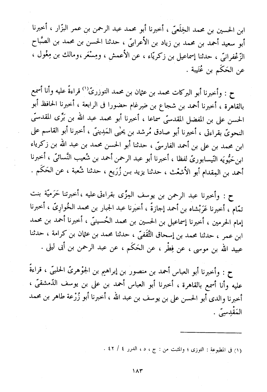 ح وَأَخْبَرَنَا أَبُو الْبَرَكَاتِ مُحَمَّدُ بْنُ عُثْمَانَ بْنِ مُحَمَّدٍ التوزري قِرَاءَةً عَلَيْهِ وَأَنَا أَسْمَعُ بِالْقَاهِرَةِ أَخْبَرَنَا أَحْمَدُ بْنُ شُجَاعِ بْنِ ضِرْغَامٍ حُضُورًا فِي الرَّابِعَةِ أَخْبَرَنَا الْحَافِظُ أَبُو الْحَسَنِ عَلِيُّ بْنُ الْمُفَضَّلِ الْمَقْدِسِيُّ سَمَاعًا أَخْبَرَنَا أَبُو مُحَمَّدٍ عَبْدُ اللَّهِ بْنُ بَرِّيٍّ الْمَقْدِسِيُّ النَّحْوِيُّ بِقِرَاءَتِي أَخْبَرَنَا أَبُو صَادِقٍ مُرْشِدُ بْنُ يحيى الْمَدِينِيّ أخبرنَا أَبُو الْقَاسِم عَليّ ابْن مُحَمَّدِ بْنِ عَلِيِّ بْنِ أَحْمَدَ الْفَارِسِيُّ حَدَّثَنَا أَبُو الْحَسَنِ مُحَمَّدُ بْنُ عَبْدِ اللَّهِ بْنِ زَكَرِيَّاء ابْن حَيُّوَيْهِ النَّيْسَابُورِيُّ لَفْظًا أَخْبَرَنَا أَبُو عَبْدِ الرَّحْمَنِ أَحْمَدُ بْنُ شُعَيْبٍ النَّسَائِيُّ أَخْبَرَنَا أَحْمَدُ بْنُ الْمِقْدَامِ أَبُو الأَشْعَثِ حَدَّثَنَا يَزِيدُ بْنُ زُرَيْعٍ حَدَّثَنَا شُعْبَةُ عَنِ الْحَكَمِ
