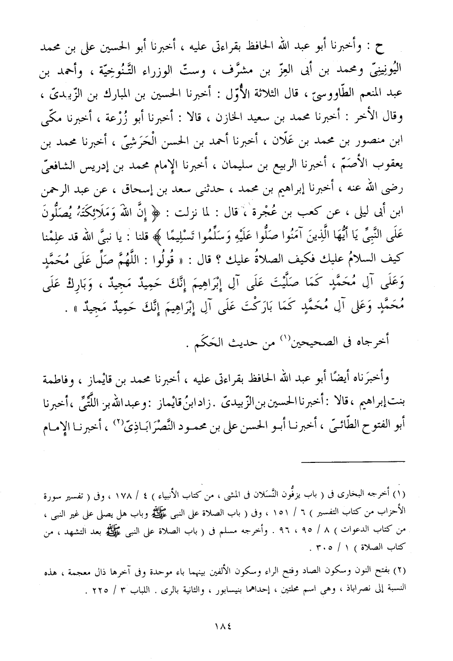 ح وَأَخْبَرَنَا أَبُو عَبْدِ اللَّهِ الْحَافِظُ بِقِرَاءَتِي عَلَيْهِ أَخْبَرَنَا أَبُو الْحُسَيْنِ عَلِيُّ بْنُ مُحَمَّدٍ اليونيني وَمُحَمّد بن أبي الْعِزّ بن مشرف وَسِتُّ الْوُزَرَاءِ التَّنُوخِيَّةُ وَأَحْمَدُ بْنُ عَبْدِ الْمُنْعِمِ الطاووسي قَالَ الثَّلَاثَة الأول أخبرنَا الْحُسَيْن بن الْمُبَارك بْنِ الزُّبَيْدِيِّ وَقَالَ الآخَرُ أَخْبَرَنَا مُحَمَّدُ بْنُ سَعِيدٍ الْخَازِنُ قَالا أَخْبَرَنَا أَبُو زُرْعَةَ أَخْبَرَنَا مكي ابْن مَنْصُورِ بْنِ مُحَمَّدِ بْنِ عَلانَ أَخْبَرَنَا أَحْمَدُ بْنُ الْحَسَنِ الْحَرَشِيُّ أَخْبَرَنَا مُحَمَّدُ بْنُ يَعْقُوبَ الأَصَمُّ أَخْبَرَنَا الرَّبِيعُ بْنُ سُلَيْمَانَ أَخْبَرَنَا الإِمَامُ مُحَمَّدُ بْنُ إِدْرِيسَ الشَّافِعِيُّ رَضِيَ اللَّهُ عَنْهُ أَخْبَرَنَا إِبْرَاهِيمُ بْنُ مُحَمَّدٍ حَدَّثَنِي سَعْدُ بْنُ إِسْحَاقَ عَنْ عَبْدِ الرَّحْمَنِ ابْنِ أَبِي لَيْلَى عَنْ كَعْبِ بْنِ عُجْرَةَ قَالَ لَمَّا نَزَلَتْ {إِن الله وَمَلَائِكَته يصلونَ على النَّبِي يَا أَيهَا الَّذين آمنُوا صلوا عَلَيْهِ وسلموا تَسْلِيمًا} قُلْنَا يَا نَبِيَّ اللَّهِ قَدْ عَلِمْنَا كَيْفَ السَّلامُ عَلَيْكَ فَكَيْفَ الصَّلاةُ عَلَيْكَ قَالَ قُولُوا اللَّهُمَّ صَلِّ عَلَى مُحَمَّدٍ وَعَلَى آلِ مُحَمَّدٍ كَمَا صَلَّيْتَ عَلَى آلِ إِبْرَاهِيمَ إِنَّكَ حُمَيْدٌ مَجِيدٌ وَبَارِكْ عَلَى مُحَمَّدٍ وَعَلَى آلِ مُحَمَّدٍ كَمَا بَارَكْتَ عَلَى آلِ إِبْرَاهِيمَ إِنَّكَ حُمَيْدٌ مَجِيدٌ