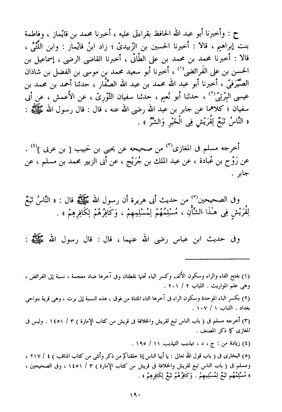 ح وَأَخْبَرَنَا أَبُو عَبْدِ اللَّهِ الْحَافِظُ بِقِرَاءَتِي عَلَيْهِ أَخْبَرَنَا مُحَمَّدُ بْنُ قايمازَ وَفَاطِمَةُ بِنْتُ إِبْرَاهِيمَ قَالا أَخْبَرَنَا الْحُسَيْنُ بْنُ الزُّبَيْدِيِّ زَادَ ابْن قايمازَ وَابْنُ اللَّتِّيِّ قَالا أَخْبَرَنَا مُحَمَّدُ بْنُ مُحَمَّدِ بْنِ عَلِيٍّ الطَّائِيُّ أَخْبَرَنَا الْقَاضِي الرَّضِيُّ إِسْمَاعِيلُ بْنُ الْحَسَنِ بْنِ عَلِيٍّ الْفَرَائِضِيُّ أَخْبَرَنَا أَبُو سَعِيدٍ مُحَمَّدُ بْنُ مُوسَى بْنِ الْفَضْلِ بْنِ شَاذَانَ الصَّيْرَفِيُّ أَخْبَرَنَا أَبُو عَبْدِ اللَّهِ مُحَمَّدُ بْنُ عَبْدِ اللَّهِ الصَّفَّارُ حَدَّثَنَا أَحْمَدُ بْنُ مُحَمَّدِ بْنِ عِيسَى الْبِرْتِيُّ حَدَّثَنَا أَبُو نُعْيَمٍ حَدَّثَنَا سُفْيَانُ الثَّوْرِيُّ عَنِ الأَعْمَشِ عَنْ أَبِي سُفْيَانَ كِلاهُمَا عَنْ جَابِرِ بْنِ عَبْدِ اللَّهِ رَضِيَ اللَّهُ عَنْهُ قَالَ قَالَ رَسُولُ اللَّهِ صَلَّى اللَّهُ عَلَيْهِ وَسَلَّمَ النَّاسُ تَبَعٌ لِقُرَيْشٍ فِي الْخَيْرِ وَالشَّرِّ