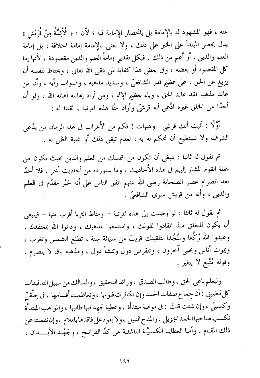 ثمَّ نقُول لَهُ ثَانِيًا يَنْبَغِي أَن تكون من التَّمَسُّك من الْعلم وَالدّين بِحَيْثُ تكون من جملَة الْقَوْم الْمشَار إِلَيْهِم فِي هَذِهِ الْأَحَادِيث وَمَا سنورده من أَحَادِيث أخر فَلَا أحد بعد انصرام عصر الصَّحَابَة رَضِيَ اللَّهُ عَنْهُمْ اتّفق النَّاس عَلَى أَنه حبر مقدم فِي الْعلم وَالدّين وَأَنه من قُرَيْش سوى الشَّافِعِي