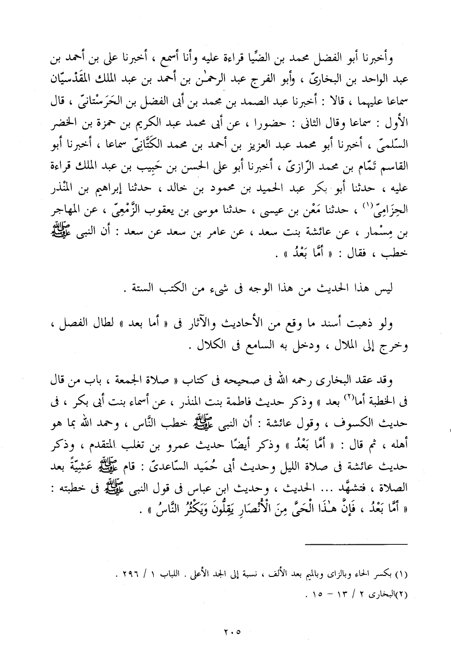 وَلَوْ ذَهَبْتُ أُسْنِدُ مَا وَقَعَ مِنَ الأَحَادِيثِ وَالآثَارِ فِي أَمَّا بَعْدُ لَطَالَ الْفَصْلُ وَخَرَجَ إِلَى الْمَلالِ وَدَخَلَ بِهِ السَّامِعُ فِي الْكَلالِ