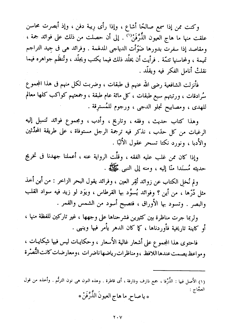 وَكنت مِمَّن إِذا سمع صَالحا أشاع وَإِذا رأى رِيبَة دفن وَإِذ أَبْصرت محَاسِن علقت مِنْهَا مَا هاج الْعُيُون الذرفن إِلَى أَن حصلت من ذَلِك عَلَى فَوَائِد جمة ومقاصد إِذا سفرت بدورها ضوأت الدياجي المدلهمة وفرائد هِيَ فِي جيد التراجم تَمِيمَة ولمحاسنها تَتِمَّة فَرَأَيْت أَن يخلد ذَلِك فِيمَا يكْتب ويجلد وتنظم جواهره فِيمَا نقلت أنامل الْفِكر فِيهِ ويقلد