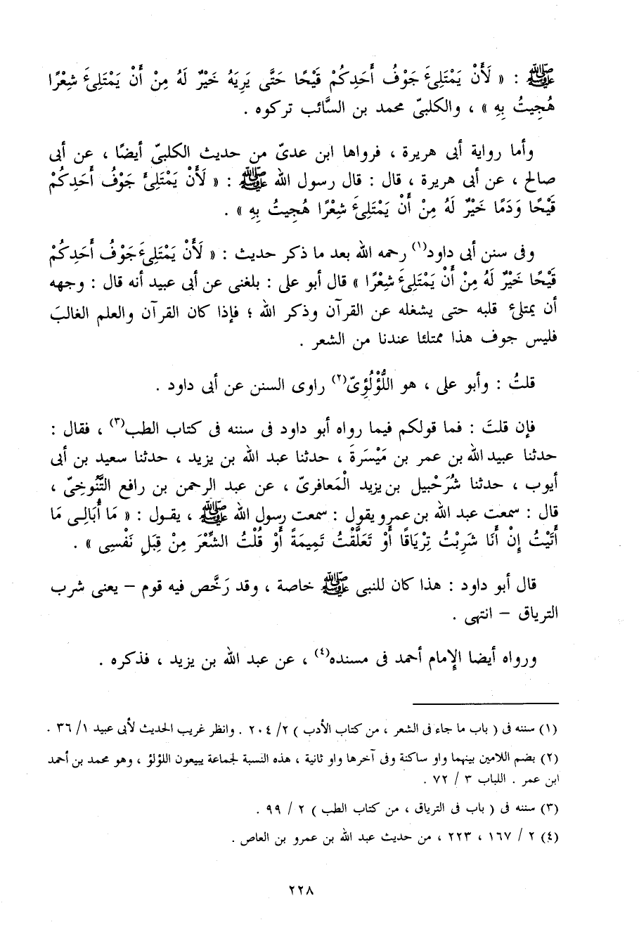 وَفِي سنَن أَبِي دَاوُد رَحمَه اللَّه بعد مَا ذكر حَدِيث لِأَن يمتلىء جَوف أحدكُم قَيْحا خير لَهُ من أَن يمتلىء شعرًا قَالَ أَبُو عَلِيّ بَلغنِي عَن أَبِي عبيد أَنه قَالَ وَجهه أَن يمتلىء قلبه حَتَّى يشْغلهُ عَن الْقُرْآن وَذكر اللَّه فَإِذا كَانَ الْقُرْآن وَالْعلم الْغَالِب فَلَيْسَ جَوف هَذَا ممتلئا عندنَا من الشّعْر