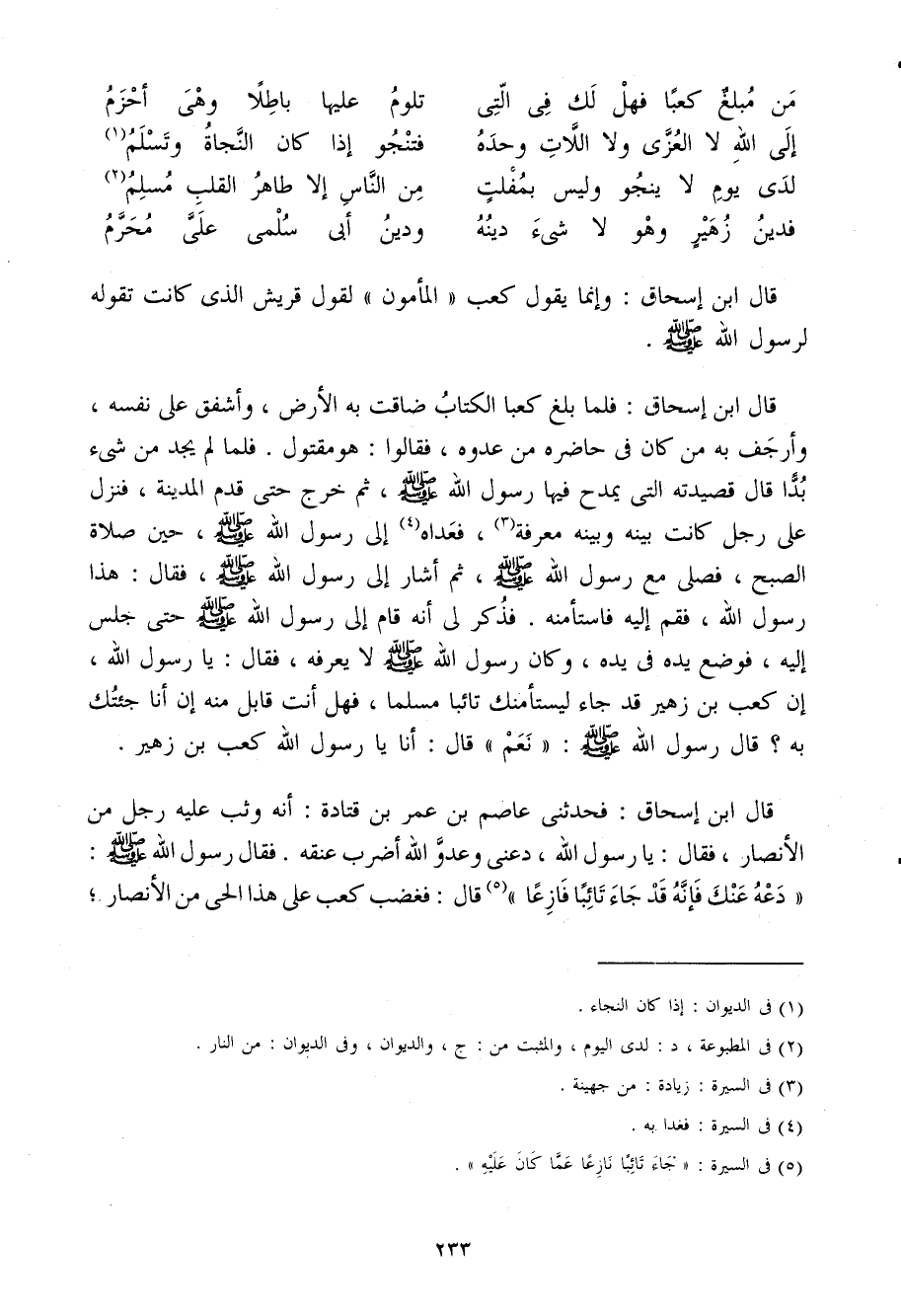 قَالَ ابْن إِسْحَاق فَلَمَّا بلغ كَعْبًا الْكتاب ضَاقَتْ بِهِ الأَرْض وأشفق عَلَى نَفسه وأرجف بِهِ من كَانَ فِي حاضره من عدوه فَقَالُوا هُوَ مقتول فَلَمَّا لم يجد من شَيْء بدا قَالَ قصيدته الَّتِي يمدح فِيهَا رَسُول اللَّهِ صَلَّى اللَّهُ عَلَيْهِ وَسَلَّمَ ثمَّ خرج حَتَّى قدم الْمَدِينَة فَنزل عَلَى رجل كَانَت بَينه وَبَينه معرفَة فعداه إِلَى رَسُول الله صلى الله عَلَيْهِ وَسلم حِين صَلَاة الصُّبْح فصلى مَعَ رَسُول اللَّهِ صَلَّى اللَّهُ عَلَيْهِ وَسَلَّمَ ثمَّ أَشَارَ إِلَى رَسُول الله صلى الله عَلَيْهِ وَسلم فَقَالَ هَذَا رَسُول الله فَقُمْ إِلَيْهِ فاستأمنه فَذكر لي أَنه قَامَ إِلَى رَسُول الله صلى الله عَلَيْهِ وَسلم حَتَّى جلس إِلَيْهِ فَوضع يَده فِي يَده وَكَانَ رَسُول اللَّهِ صَلَّى اللَّهُ عَلَيْهِ وَسَلَّمَ لَا يعرفهُ فَقَالَ يَا رَسُول اللَّهِ إِن كَعْب بْن زُهَيْر قد جَاءَ لِيَسْتَأْمِنَكَ تَائِبًا مُسلما فَهَل أَنْت قَابل مِنْهُ إِن أَنا جئْتُك بِهِ قَالَ رَسُولُ اللَّهِ صَلَّى اللَّهُ عَلَيْهِ وَسَلَّمَ نعم قَالَ أَنا يَا رَسُول اللَّهِ كَعْب بْن زُهَيْر