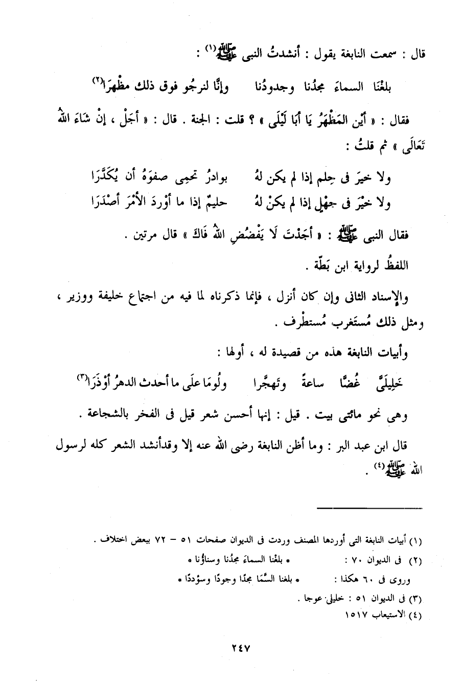 قَالَ ابْنُ عَبْدِ الْبَرِّ وَمَا أَظُنُّ النَّابِغَةَ رَضِيَ اللَّهُ عَنْهُ إِلا وَقَدْ أَنْشَدَ الشِّعْرَ كُلَّهُ لِرَسُولِ اللَّهِ صَلَّى اللَّهُ عَلَيْهِ وَسَلَّمَ