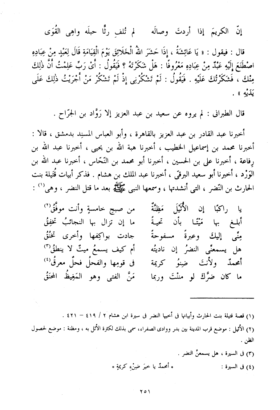 أَخْبَرَنَا عَبْدُ الْقَادِرِ بْنُ عَبْدِ الْعَزِيزِ بِالْقَاهِرَةِ وَأَبُو الْعَبَّاسِ الْمُسْنِدُ بِدِمَشْقَ قَالا أَخْبَرَنَا مُحَمَّدُ بْنُ إِسْمَاعِيلَ الْخَطِيبُ أَخْبَرَنَا هِبَةُ اللَّهِ بْنُ يَحْيَى أَخْبَرَنَا عَبْدُ اللَّهِ بْنُ رِفَاعَةَ أَخْبَرَنَا عَلِيُّ بْنُ الْحُسَيْنِ أَخْبَرَنَا أَبُو مُحَمَّدِ بْنُ النَّحَّاسِ أَخْبَرَنَا عَبْدُ اللَّهِ بْنُ الْوَرْدِ أَخْبَرَنَا أَبُو سَعِيدٍ الْبَرْقِيُّ أَخْبَرَنَا عَبْدُ الْمَلِكِ بْنُ هِشَامٍ فَذَكَرَ أَبْيَاتَ قُتَيْلَةَ بِنْتِ الْحَارِثِ بْنِ النَّضْرِ الَّتِي أَنْشَدَتْهَا وَسَمِعَهَا النَّبِيُّ صَلَّى اللَّهُ عَلَيْهِ وَسَلَّمَ بَعْدَ مَا قُتِلَ النَّضْرُ وَهِيَ