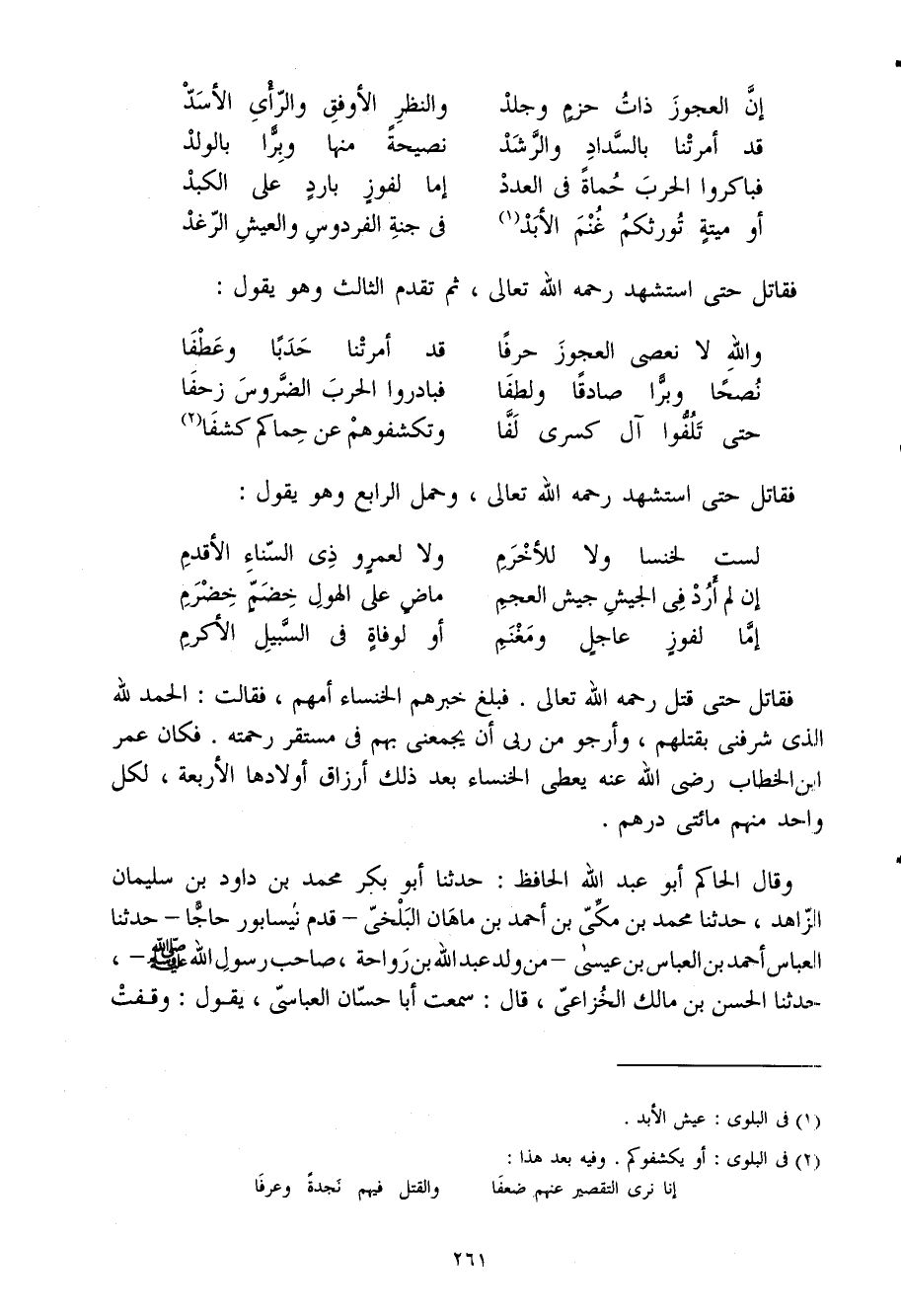 فقاتل حَتَّى قتل رَحمَه اللَّه تَعَالَى فَبلغ خبرهم الخنساء أمّهم فَقَالَت الْحَمد لله الَّذِي شرفني بِقَتْلِهِم وَأَرْجُو من رَبِّي أَن يجمعني بهم فِي مُسْتَقر رَحمته فَكَانَ عمر ابْن الْخطاب رَضِيَ اللَّهُ عَنْهُ يُعْطي الخنساء بعد ذَلِك أرزاق أَوْلَادهَا الْأَرْبَعَة لكل وَاحِد مِنْهُم مِائَتي دِرْهَم