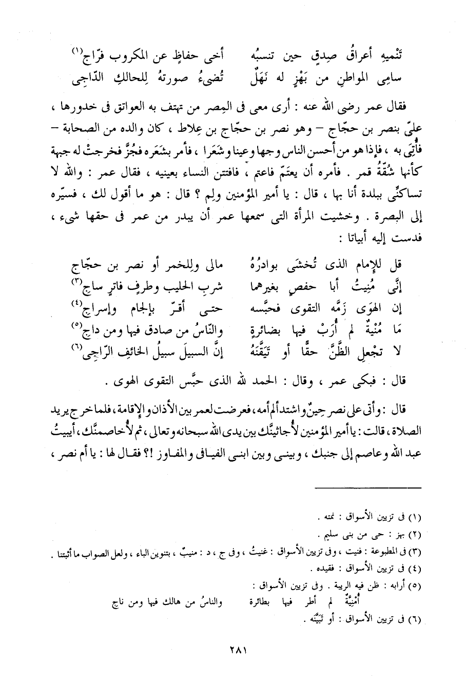 فَقَالَ عمر رَضِيَ اللَّهُ عَنْهُ أرى معي فِي الْمصر من تهتف بِهِ الْعَوَاتِق فِي خدورها عَلِيّ بنصر بْن حجاج وَهُوَ نصر بْن حجاج بْن علاط كَانَ وَالِده من الصَّحَابَة فَأتي بِهِ فَإِذا هُوَ من أحسن النَّاس وَجها وعينا وشعرا فَأمر بِشعرِهِ فجز فَخرجت لَهُ جبهة كَأَنَّهَا شقة قمر فَأمره أَن يعتم فاعتم فَافْتتنَ النِّسَاء بِعَيْنيهِ فَقَالَ عمر وَالله لَا تساكني ببلدة أَنا بهَا قَالَ يَا أَمِير الْمُؤمنِينَ وَلم قَالَ هُوَ ماأقول لَك فسيره إِلَى الْبَصْرَة وخشيت الْمَرْأَة الَّتِي سَمعهَا عمر أَن يبدر من عمر فِي حَقّهَا شَيْء فدست إِلَيْهِ أبياتا
