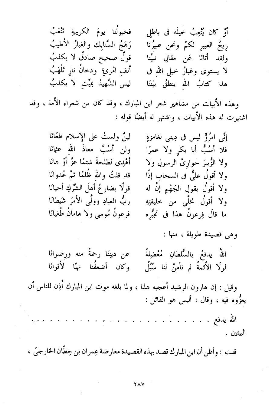 قلت وأظن ان ابْن الْمُبَارك قصد بِهَذِهِ القصيدة مُعَارضَة عمرَان بن حطَّان الْخَارِجِي