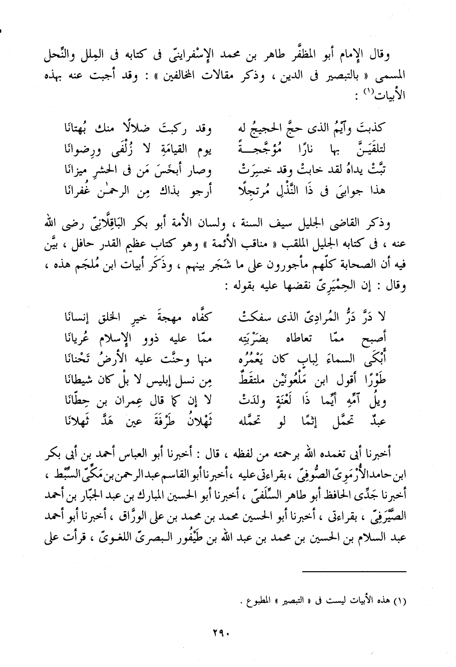 وَقَالَ الإِمَام أَبُو المظفر طَاهِر بْن مُحَمَّد الإسفرايني فِي كِتَابه فِي الْملَل والنحل الْمُسَمّى بالتبصير فِي الدّين وَذكر مقالات الْمُخَالفين وَقد أجبْت عَنهُ بِهَذِهِ الأبيات