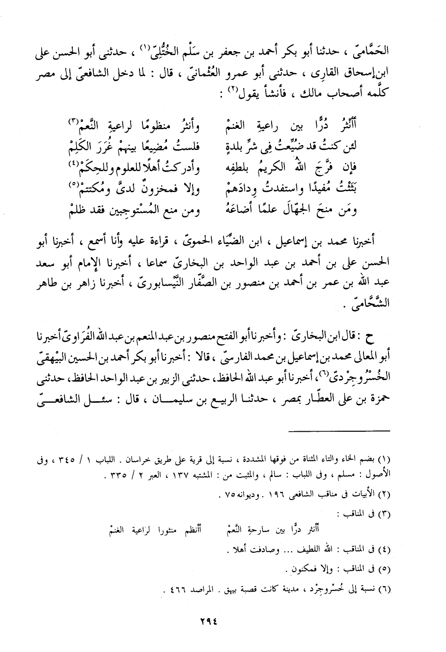 ح قَالَ ابْن البُخَارِيّ وأَخْبَرَنَا أَبُو الْفَتْح مَنْصُور بْن عَبْد الْمُنعم بْن عَبْد اللَّه الفراوي أَخْبَرَنَا أَبُو الْمَعَالِي مُحَمَّد بْن إِسْمَاعِيل بْن مُحَمَّد الْفَارِسِي قَالا أخبرنَا أَبُو بكر أَحْمد بن الْحُسَيْن الْبَيْهَقِيّ الخسروجردي أَخْبَرَنَا أَبُو عَبْد اللَّه الْحَافِظ حَدَّثَنِي الزبير بْن عَبْد الْوَاحِد الْحَافِظ حَدَّثَنِي حَمْزَة بْن عَلِيّ الْعَطَّار بِمصْر حَدثنَا الرّبيع بْن سُلَيْمَان قَالَ سُئِلَ الشَّافِعِيّ