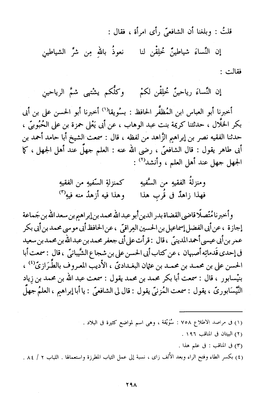 وأَخْبَرَنَا مُتَّصِلا قَاضِي الْقُضَاة بدر الدّين أَبُو عَبْد اللَّه مُحَمَّد بْن إِبْرَاهِيم بْن سعد اللَّه بن جمَاعَة إِجَازَةً عَن أَبِي الْفضل إِسْمَاعِيل بْن الْحُسَيْن الْعِرَاقِيّ عَن الْحَافِظ أَبِي مُوسَى مُحَمَّد بْن أَبِي بكر عمر بْن أَبِي عِيسَى أَحْمَد الْمَدِينِيّ قَالَ قَرَأت عَلَى أَبِي جَعْفَر مُحَمَّد بن عبد الله بن مُحَمَّد بن سَعِيد فِي إِحْدَى قدماته أَصْبَهَان عَن كتاب أَبِي الْحَسَن عَلِيّ بْن شُجَاع الشَّيْبَانِيّ قَالَ سَمِعت أَبَا الْحَسَن عَلِيّ بْن مُحَمَّد بْن مُحَمَّد بْن عُثْمَان الْبَغْدَادِيّ الأديب الْمَعْرُوف بالطرازي بِنَيْسَابُورَ قَالَ سَمِعت أَبَا بكر مُحَمَّد بْن مُحَمَّد يَقُول سَمِعت عَبْد اللَّه بْن مُحَمَّد بْن زِيَاد النَّيْسَابُورِي يَقُول سَمِعت الْمُزنِيّ يَقُول قَالَ لي الشَّافِعِي يَا أَبَا إِبْرَاهِيم الْعلم جهل