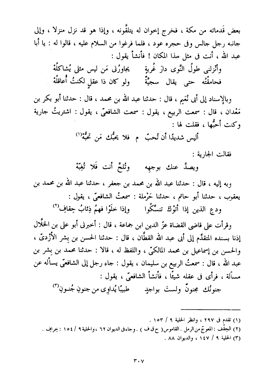 وقرأت عَلَى قَاضِي الْقُضَاة عز الدّين ابْن جمَاعَة قَالَ أَخْبرنِي أَبُو عَلِيّ بْن الْخلال إِذْنا بِسَنَدِهِ الْمُتَقَدّم إِلَى أَبِي عَبْد اللَّه الْقطَّان قَالَ حَدثنَا الْحَسَن بْن بشر الْأَزْدِيّ والْحَسَن بْن إِسْمَاعِيل بْن مُحَمَّد الْمَالِكِي وَاللَّفْظ لَهُ قَالا حَدثنَا مُحَمَّد بْن بشر بْن عَبْد اللَّه قَالَ سَمِعت الرّبيع بْن سُلَيْمَان يَقُول جَاءَ رجل إِلَى الشَّافِعِي يسْأَله عَن مَسْأَلَة قرأي فِي عقله شَيْئا فَأَنْشَأَ الشَّافِعِي يَقُول
