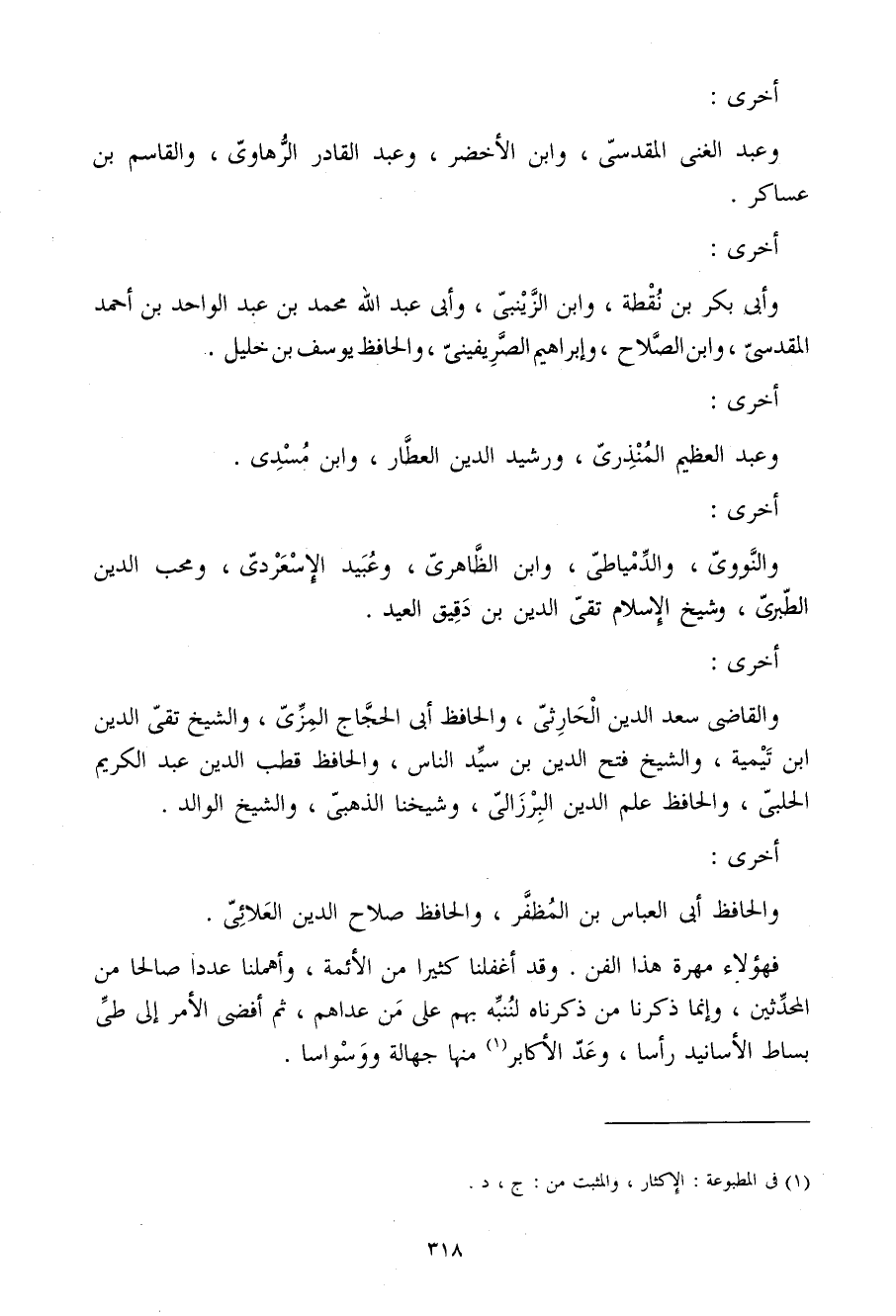 فَهَؤُلَاءِ مهرَة هَذَا الْفَنّ وَقد أَغْفَلنَا كثيرا من الْأَئِمَّة وأهملنا عددا صَالحا من الْمُحدثين وَإِنَّمَا ذكرنَا من ذَكرْنَاهُ لننبه بهم عَلَى من عداهم ثمَّ أفْضى الْأَمر إِلَى طي بِسَاط الْأَسَانِيد رَأْسا وعد الأكابر مِنْهَا جَهَالَة ووسواسا