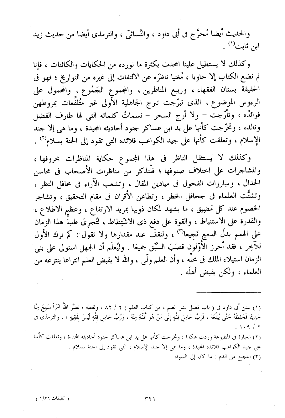 وَكَذَلِكَ لَا يستثقل النَّاظر فِي هَذَا الْمَجْمُوع حِكَايَة المناظرات بحروفها والمشاجرات عَلَى اخْتِلَاف صنوفها فلنذكر من مناظرات الْأَصْحَاب فِي محَاسِن الْجِدَال ومبارزات الفحول فِي ميادين الْمقَال وتشعب الآراء فِي محافل النّظر وتشتت الْعلمَاء فِي جحافل الْخطر وتطاعن الأقران فِي مقَام التَّحْقِيق وتشاجر الْخُصُوم عِنْد كل مضيق مَا يشْهد لمَكَان ذويها بمزيد الِارْتفَاع وعظيم الِاطِّلَاع وَالْقُدْرَة عَلَى الاستنباط وَالْقُوَّة عَلَى دفع ذِي الاشتطاط لتجري طلبة هَذَا الزَّمَان عَلَى الهمم بدل الدمع نجيعا ولتقف عِنْد مقدارها وَلَا تَقول كم ترك الأول للْآخر فقد أحرز الْأَولونَ قصب السَّبق جَمِيعًا وليعلم أَن الْجَهْل استولى عَلَى بني الزَّمَان اسْتِيلَاء الْملك فِي مَحَله وَأَن الْعلم ولى وَالله لَا يقبض الْعلم انتزاعا ينتزعه من الْعلمَاء وَلَكِن يقبض أَهله