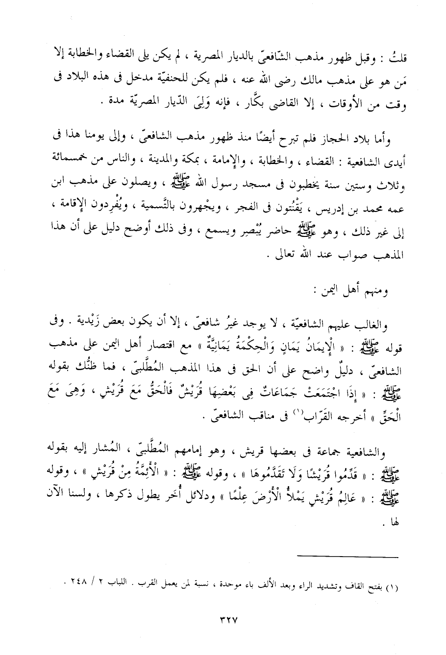 وَالشَّافِعِيَّة جمَاعَة فِي بَعْضهَا قُرَيْش وَهُوَ إمَامهمْ المطلبي الْمشَار إِلَيْهِ بقوله صَلَّى اللَّهُ عَلَيْهِ وَسَلَّمَ قدمُوا قُريْشًا وَلَا تقدموها وَقَوله صَلَّى اللَّهُ عَلَيْهِ وَسَلَّمَ الْأَئِمَّة من قُرَيْش وَقَوله صَلَّى اللَّهُ عَلَيْهِ وَسَلَّمَ علام قُرَيْش يمْلَأ الأَرْض علما وَدَلَائِل أخر يطول ذكرهَا ولسنا الْآن لَهَا