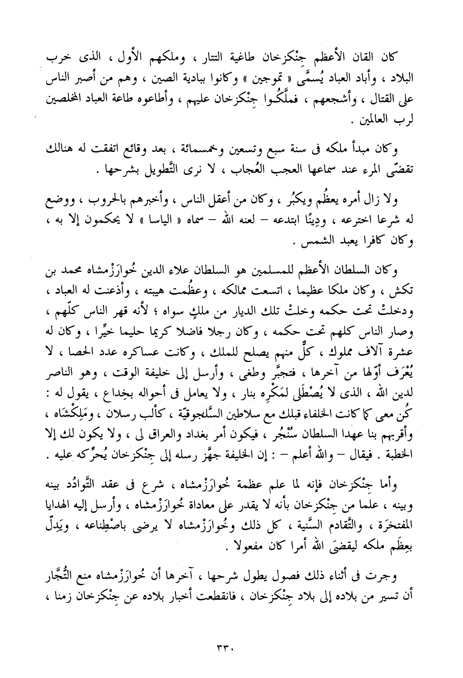 وَكَانَ السُّلْطَان الْأَعْظَم للْمُسلمين هُوَ السُّلْطَان عَلَاء الدّين خوارز مَشاهُ مُحَمَّد بْن تكش وَكَانَ ملكا عَظِيما اتسعت ممالكه وعظمت هيبته وأذعنت لَهُ الْعباد وَدخلت تَحت حكمه وخلت تِلْكَ الديار من ملك سواهُ لِأَنَّهُ قهر النَّاس كلهم وَصَارَ النَّاس كلهم تَحت حكمه وَكَانَ رجلا فَاضلا كَرِيمًا حَلِيمًا خيرا وَكَانَ لَهُ عشرَة آلَاف مَمْلُوك كل مِنْهُم يصلح للْملك وَكَانَت عساكره عدد الْحَصَا لَا يعرف أَولهَا من آخرهَا فتجبر وطغى وَأرْسل إِلَى خَليفَة الْوَقْت وَهُوَ النَّاصِر لدين اللَّه الَّذِي لَا يصطلي لمكره بِنَار وَلَا يُعَامل فِي أَحْوَاله بخداع يَقُول لَهُ كن معي كَمَا كَانَت الْخُلَفَاء قبلك مَعَ سلاطين السلجوقية كألب رسْلَان وملكشاه وأقربهم بِنَا عهدا السُّلْطَان سنجر فَيكون أَمر بَغْدَاد وَالْعراق لي وَلَا يكون لَك إِلَّا الْخطْبَة فَيُقَال وَالله أعلم إِن الْخَلِيفَة جهز رسله إِلَى جنكزخان يحركه عَلَيْهِ