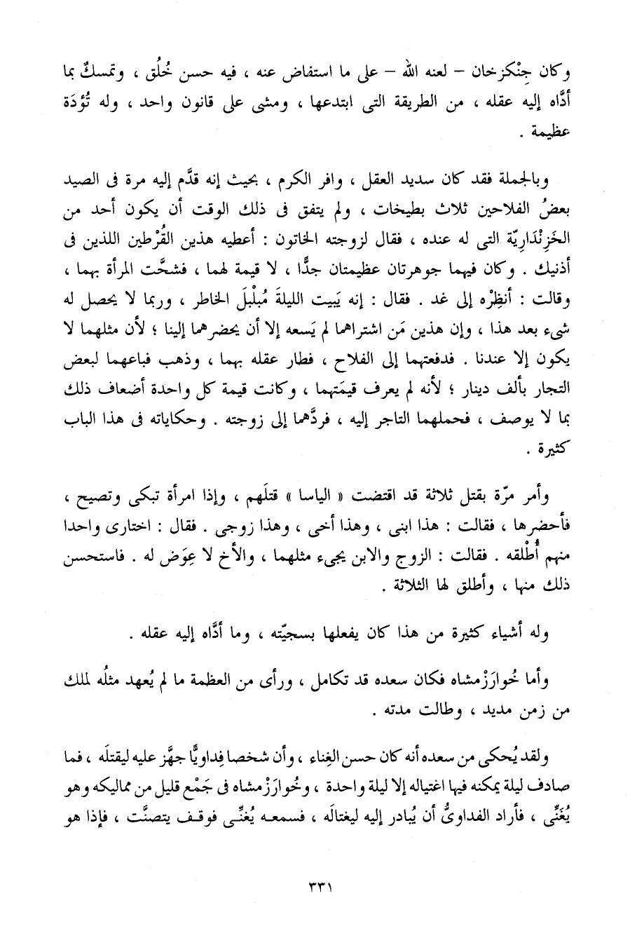 وَكَانَ جنكزخان لَعنه اللَّه عَلَى مَا استفاض عَنهُ فِيهِ حسن خلق وَتمسك بِمَا أَدَّاهُ إِلَيْهِ عقله من الطَّرِيقَة الَّتِي ابتدعها وَمَشى عَلَى قانون وَاحِد وَله تؤدة عَظِيمَة