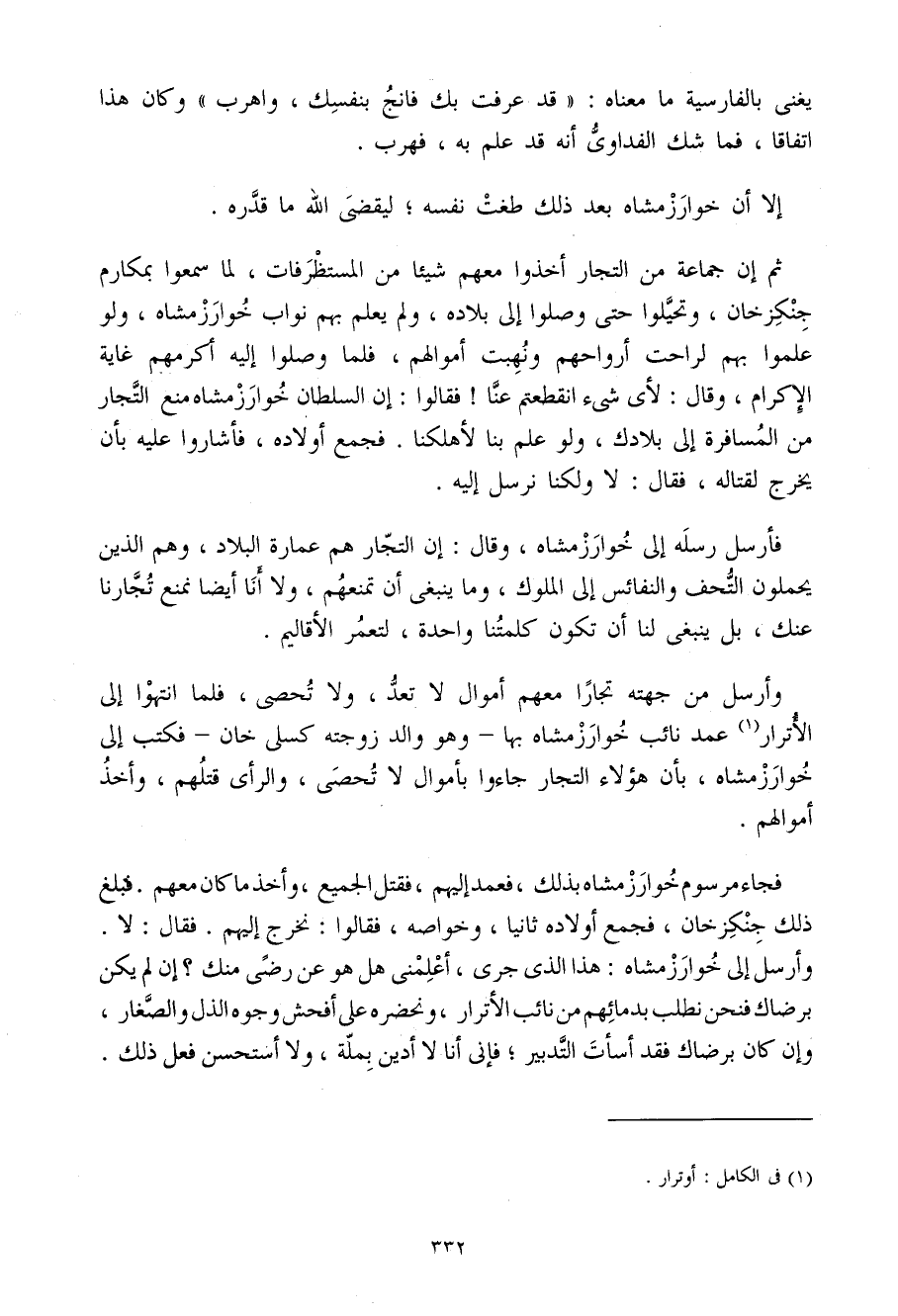 فجَاء مرسوم خوارزمشاه بذلك فَعمد إِلَيْهِم فَقتل الْجَمِيع وَأخذ مَا كَانَ مَعَهم فَبلغ ذَلِك جنكزخان فَجمع أَوْلَاده ثَانِيًا وخواصه فَقَالُوا نخرج إِلَيْهِم فَقَالَ لَا وَأرْسل إِلَى خوارزمشاه هَذَا الَّذِي جرى أعلمني هَل هُوَ عَن رضى مِنْك إِن لم يكن برضاك فَنحْن نطلب بدمائهم من نَائِب الأترار ونحضره عَلَى أفحش وُجُوه الذل وَالصغَار وَإِن كَانَ برضاك فقد أَسَأْت التَّدْبِير فَإِنِّي أَنا لَا أدين بِملَّة وَلَا أستحسن فعل ذَلِكَ