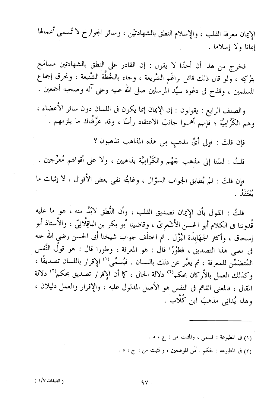 قلت القَوْل بِأَن الْإِيمَان تَصْدِيق الْقلب وَأَن النُّطْق لَا بُد مِنْهُ هُوَ مَا عَلَيْهِ قدوتنا فِي الْكَلَام أَبُو الْحَسَن الْأَشْعَرِيّ وقاضينا أَبُو بكر بْن الباقلاني والأستاذ أَبُو إِسْحَاق وَأكْثر الجهابذة البزل ثمَّ اخْتلف جَوَاب شَيخنَا أَبِي الْحَسَن رَضِيَ اللَّهُ عَنْهُ فِي معنى هَذَا التَّصْدِيق فطورا قَالَ هُوَ الْمعرفَة وطورا قَالَ هُوَ قَول النَّفس المتضمن للمعرفة ثمَّ يعبر عَن ذَلِك بِاللِّسَانِ فيسمى الْإِقْرَار بِاللِّسَانِ تَصْدِيقًا وَكَذَلِكَ الْعَمَل بالأركان بِحكم دلَالَة الْحَال كَمَا أَن الْإِقْرَار تَصْدِيق بِحكم دلَالَة الْمقَال فَالْمَعْنى الْقَائِم فِي النَّفس هُوَ الأَصْل الْمَدْلُول عَلَيْهِ وَالْإِقْرَار وَالْعَمَل دليلان وَهَذَا يدانى مَذْهَب ابْن كلاب