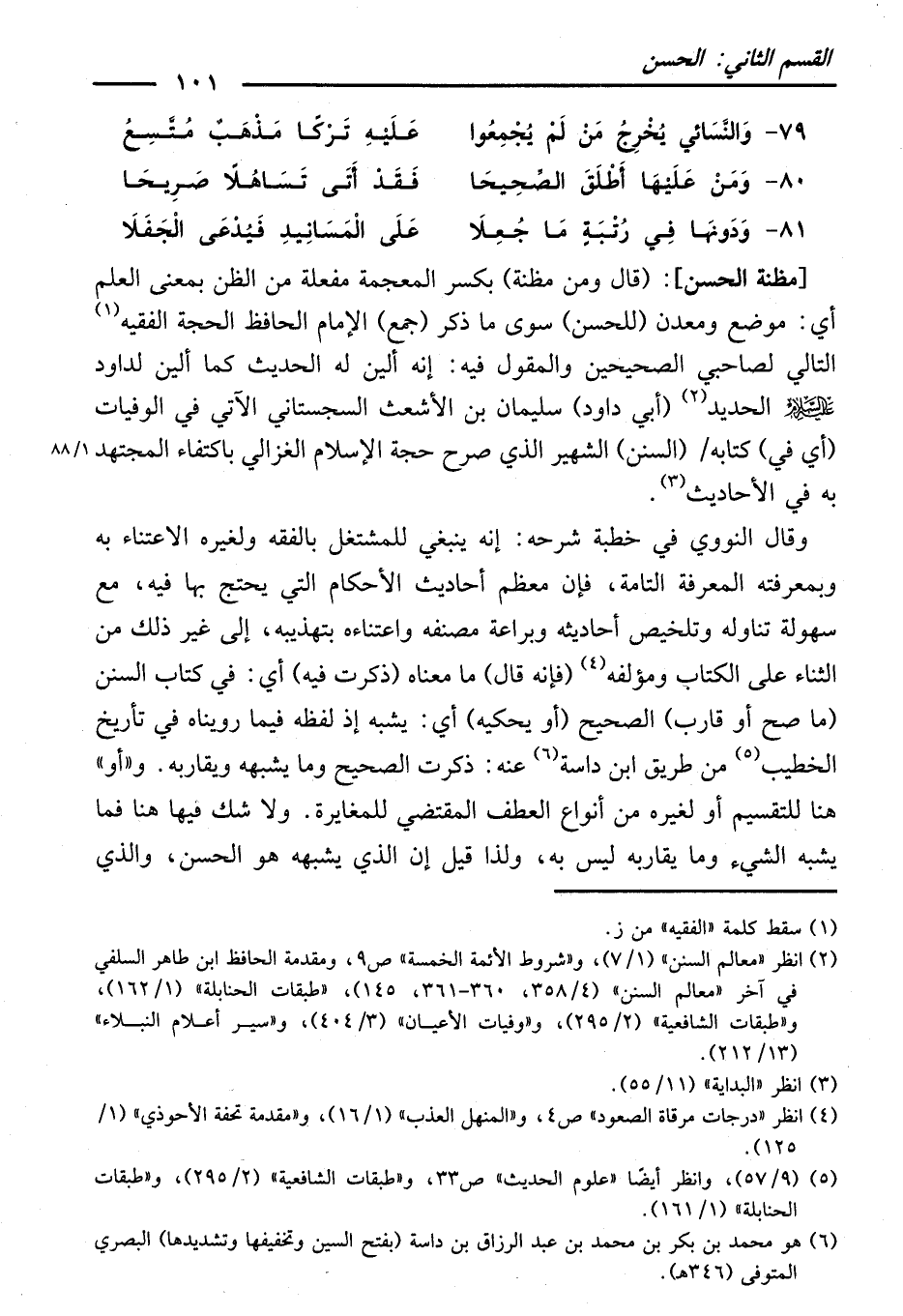 [مَظِنَّةُ الْحُسْنِ] (قَالَ: وَمِنْ مَظِنَّةٍ) بِكَسْرِ الْمُعْجَمَةِ، مَفْعِلَةٌ مِنَ الظَّنِّ بِمَعْنَى الْعِلْمِ، أَيْ مَوْضِعٍ وَمَعْدِنٍ (لِلْحُسْنِ) سِوَى مَا ذُكِرَ (جَمْعُ) الْإِمَامِ الْحَافِظِ الْحُجَّةِ الْفَقِيهِ التَّالِي لِصَاحِبَيِ الصَّحِيحَيْنِ، وَالْمَقُولِ فِيهِ: إِنَّهُ أُلِينَ لَهُ الْحَدِيثُ كَمَا أُلِينَ لِدَاوُدَ عَلَيْهِ السَّلَامُ الْحَدِيدُ (أَبِي دَاوُدَ) سُلَيْمَانَ بْنِ الْأَشْعَثِ السِّجِسْتَانِيِّ الْآتِي فِي الْوَفَيَاتِ، (أَيْ فِي) كِتَابِهِ (السُّنَنِ) الشَّهِيرِ الَّذِي صَرَّحَ حُجَّةُ الْإِسْلَامِ الْغَزَالِيُّ بِاكْتِفَاءِ الْمُجْتَهِدِ بِهِ فِي الْأَحَادِيثِ.