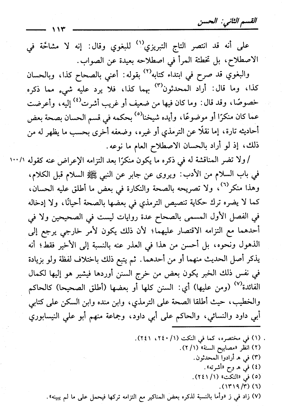 وَقَدْ قَالَ: وَمَا كَانَ فِيهَا مِنْ ضَعِيفٍ أَوْ غَرِيبٍ، أَشَرْتُ إِلَيْهِ، وَأَعْرَضْتُ عَمَّا كَانَ مُنْكَرًا أَوْ مَوْضُوعًا، وَأَيَّدَهُ شَيْخُنَا بِحُكْمِهِ فِي قِسْمِ الْحِسَانِ بِصِحَّةِ بَعْضِ أَحَادِيثِهِ تَارَةً، إِمَّا نَقْلًا عَنِ التِّرْمِذِيِّ أَوْ غَيْرِهِ، وَضَعَّفَهُ أُخْرَى بِحَسَبِ مَا يَظْهَرُ لَهُ مِنْ ذَلِكَ ; إِذْ لَوْ أَرَادَ بِالْحِسَانِ الِاصْطِلَاحَ الْعَامَّ، مَا نَوَّعَهُ.