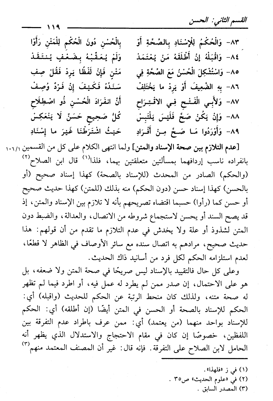 85 - وَاسْتُشْكِلَ الْحُسْنُ مَعَ الصِّحَّةِ فِي ... مَتْنٍ فَإِنْ لَفْظًا يَرِدْ فَقُلْ صِفِ