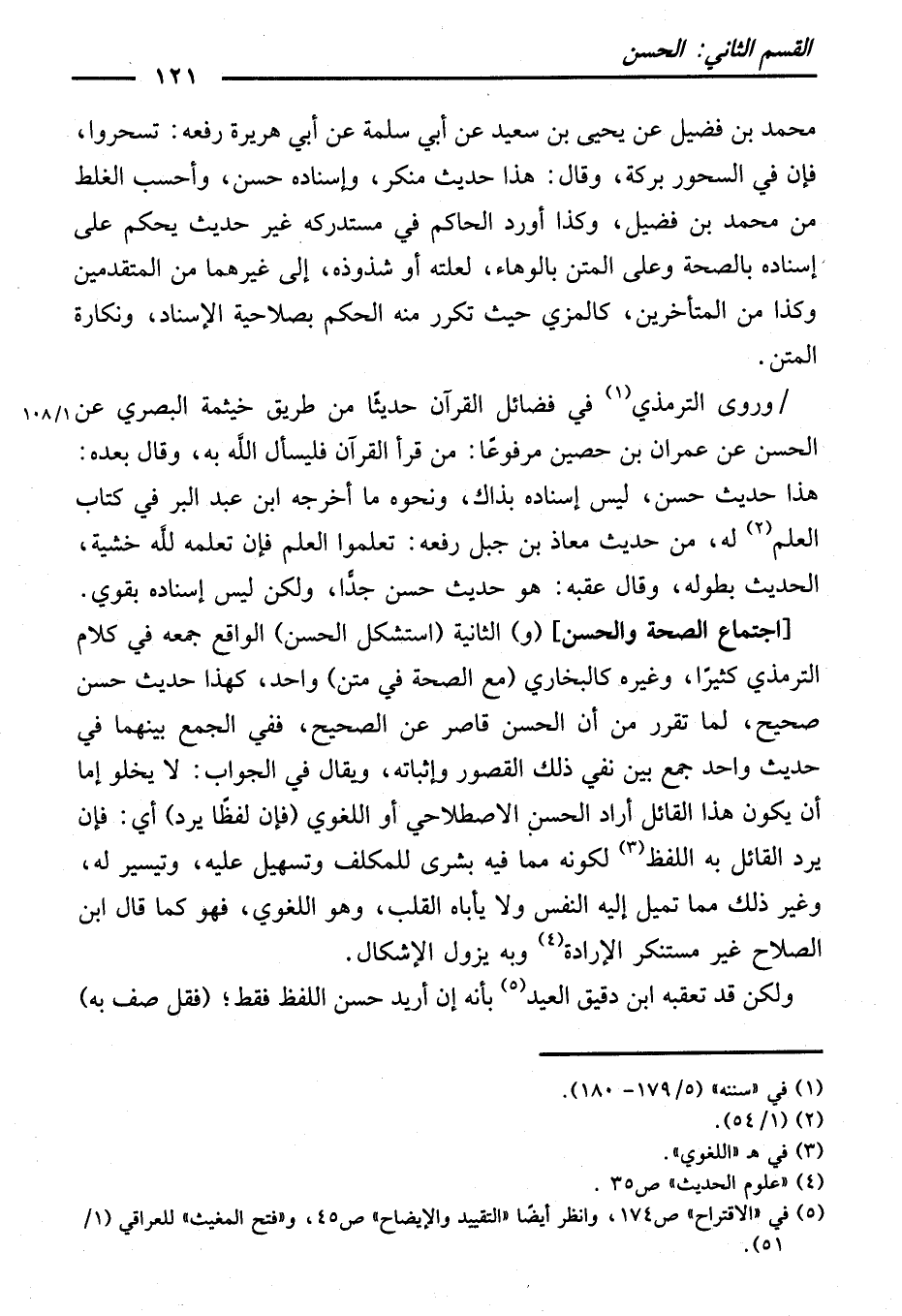 وَرَوَى التِّرْمِذِيُّ فِي فَضَائِلِ الْقُرْآنِ حَدِيثًا مِنْ طَرِيقِ خَيْثَمَةَ الْبَصْرِيِّ عَنِ الْحَسَنِ عَنْ عِمْرَانَ بْنِ حُصَيْنٍ مَرْفُوعًا: «مَنْ قَرَأَ الْقُرْآنَ، فَلْيَسْأَلِ اللَّهَ بِهِ» ، وَقَالَ بَعْدَهُ: هَذَا حَدِيثٌ حَسَنٌ، لَيْسَ إِسْنَادُهُ بِذَاكَ، وَنَحْوُهُ مَا أَخْرَجَهُ ابْنُ عَبْدِ الْبَرِّ فِي كِتَابِ الْعِلْمِ لَهُ، مِنْ حَدِيثِ مُعَاذِ بْنِ جَبَلٍ رَفَعَهُ: «تَعَلَّمُوا الْعِلْمَ، فَإِنَّ تَعَلُّمَهُ لِلَّهِ خَشْيَةٌ» . . . "، الْحَدِيثَ بِطُولِهِ، وَقَالَ عَقِبَهُ: هُوَ حَدِيثٌ حَسَنٌ جِدًّا، وَلَكِنْ لَيْسَ إِسْنَادُهُ بِقَوِيٍّ.