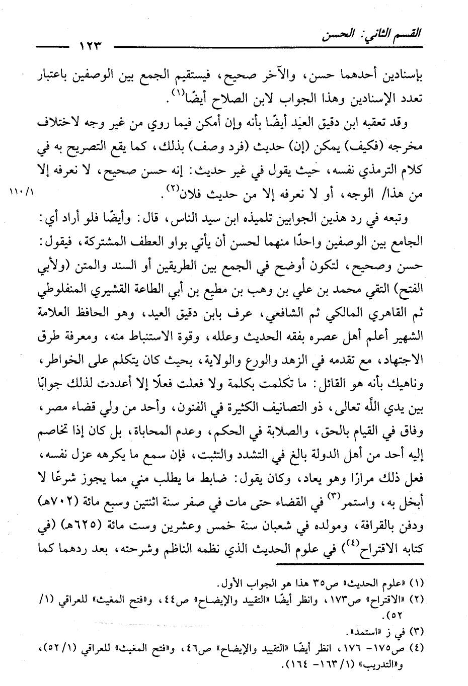 وَتَبِعَهُ فِي رَدِّ هَذَيْنِ الْجَوَابَيْنِ تِلْمِيذُهُ ابْنُ سَيِّدِ النَّاسِ، قَالَ: وَأَيْضًا فَلَوْ أَرَادَ أَيِ: الْجَامِعُ بَيْنَ الْوَصْفَيْنِ وَاحِدًا مِنْهُمَا، لَحَسُنَ أَنْ يَأْتِيَ بِوَاوِ الْعَطْفِ الْمُشْتَرَكَةِ، فَيَقُولَ: حَسَنٌ وَصَحِيحٌ ; لِتَكُونَ أَوْضَحَ فِي الْجَمْعِ بَيْنَ الطَّرِيقَيْنِ، أَوِ السَّنَدِ وَالْمَتْنِ.