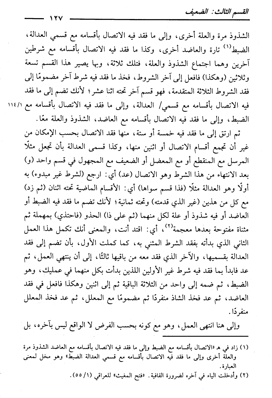 وَالْمَعْنَى أَنَّكَ تُكْمِلُ هَذَا الْعَمَلَ الثَّانِيَ الَّذِي بَدَأْتَهُ بِفَقْدِ الشَّرْطِ الْمُثَنَّى بِهِ، كَمَا كَمَّلْتَ الْأَوَّلَ ; بِأَنْ تَضُمَّ إِلَى فَقْدِ الْعَدَالَةِ بِقِسْمَيْهَا، وَالْآخَرَ الَّذِي فُقِدَ مَعَهُ مِنْ بَاقِيهَا ثَالِثًا، إِلَى أَنْ يَنْتَهِيَ الْعَمَلُ، ثُمَّ عُدْ فَابْدَأْ بِمَا فُقِدَ فِيهِ شَرْطٌ غَيْرُ الْأَوَّلَيْنِ اللَّذَيْنِ بَدَأْتَ بِكُلٍّ مِنْهُمَا فِي عَمَلَيْكَ، وَهُوَ الضَّبْطُ، ثُمَّ ضُمَّهُ إِلَى وَاحِدٍ مِنَ الثَّلَاثَةِ الْبَاقِيَةِ، ثُمَّ إِلَى اثْنَيْنِ، وَهَكَذَا فَافْعَلْ فِي فَقْدِ الْعَاضِدِ، ثُمَّ عُدْ فَخُذِ الشَّاذَّ مُنْفَرِدًا، ثُمَّ مَضْمُومًا مَعَ الْمُعَلَّلِ، ثُمَّ عُدْ فَخُذِ الْمُعَلَّلَ مُنْفَرِدًا.