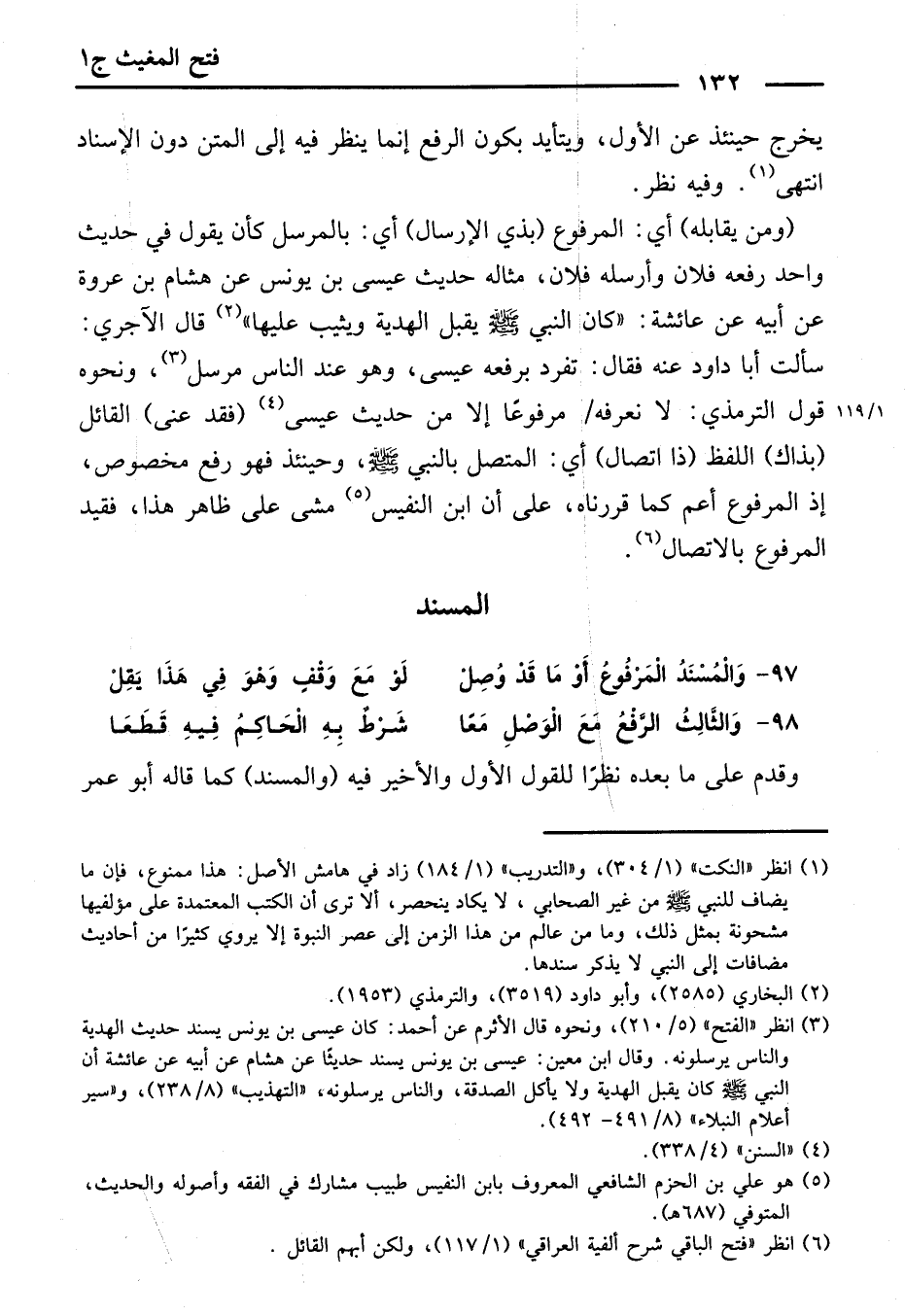97 - وَالْمُسْنَدُ الْمَرْفُوعُ أَوْ مَا قَدْ وُصِلْ ... لَوْ مَعَ وَقْفٍ وَهْوَ فِي هَذَا يَقِلْ