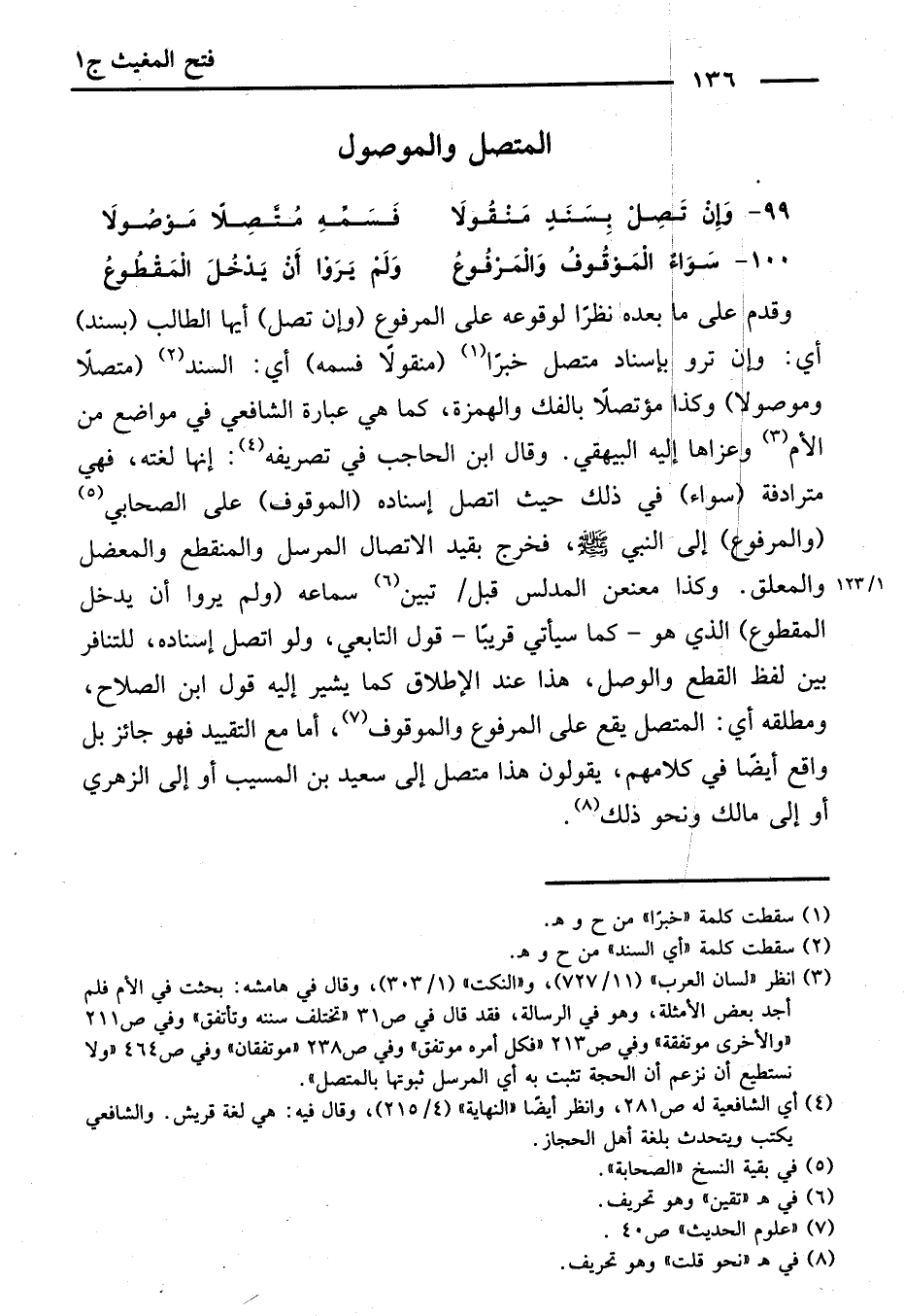وَقُدِّمَ عَلَى مَا بَعْدَهُ نَظَرًا لِوُقُوعِهِ عَلَى الْمَرْفُوعِ (وَإِنْ تَصِلْ) أَيُّهَا الطَّالِبُ (بِسَنَدٍ) أَيْ: وَإِنْ تَرْوِ بِإِسْنَادٍ مُتَّصِلٍ خَبَرًا (مَنْقُولًا فَسَمِّهِ) أَيِ: السَّنَدَ (مُتَّصِلًا وَمَوْصُولًا) ، وَكَذَا " مُؤْتَصِلًا " بِالْفَكِّ وَالْهَمْزَةِ، كَمَا هِيَ عِبَارَةُ الشَّافِعِيِّ فِي مَوَاضِعَ مِنْ (الْأُمِّ) ، وَعَزَاهَا إِلَيْهِ الْبَيْهَقِيُّ.