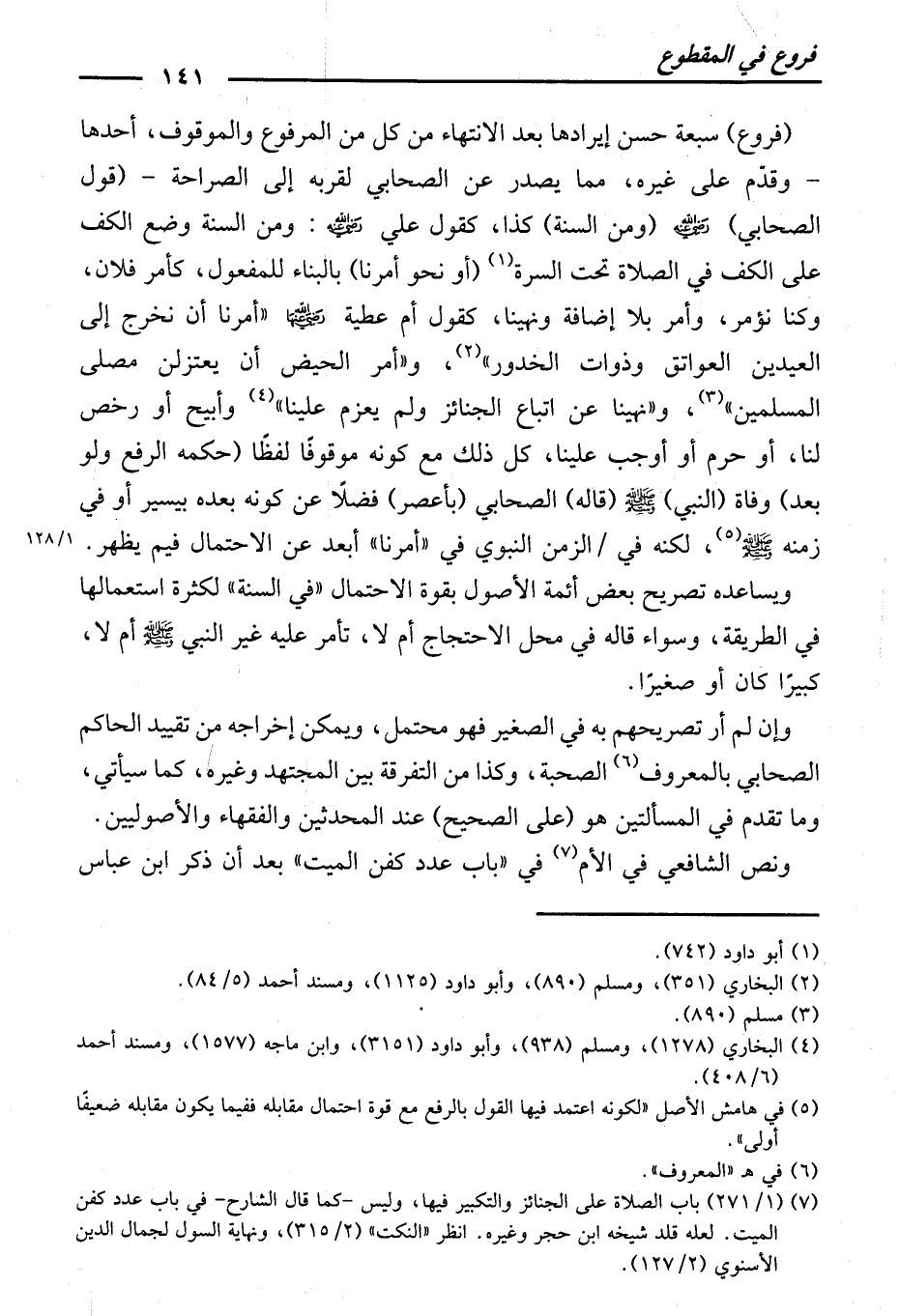 فُرُوعٌ سَبْعَةٌ حَسُنَ إِيرَادُهَا بَعْدَ الِانْتِهَاءِ مِنْ كُلٍّ مِنَ الْمَرْفُوعِ وَالْمَوْقُوفِ: أَحَدُهَا - وَقُدِّمَ عَلَى غَيْرِهِ، مِمَّا يَصْدُرُ عَنِ الصَّحَابِيِّ لِقُرْبِهِ إِلَى الصَّرَاحَةِ - (قَوْلُ الصَّحَابِيِّ) - رَضِيَ اللَّهُ عَنْهُ - (مِنَ السُّنَّةِ) كَذَا ; كَقَوْلِ عَلِيٍّ - رَضِيَ اللَّهُ عَنْهُ -: «وَمِنَ السُّنَّةِ وَضْعُ الْكَفِّ عَلَى الْكَفِّ فِي الصَّلَاةِ تَحْتَ السُّرَّةِ» . (أَوْ نَحْوُ أُمِرْنَا) بِالْبِنَاءِ لِلْمَفْعُولِ، كَأُمِرَ فُلَانٌ.