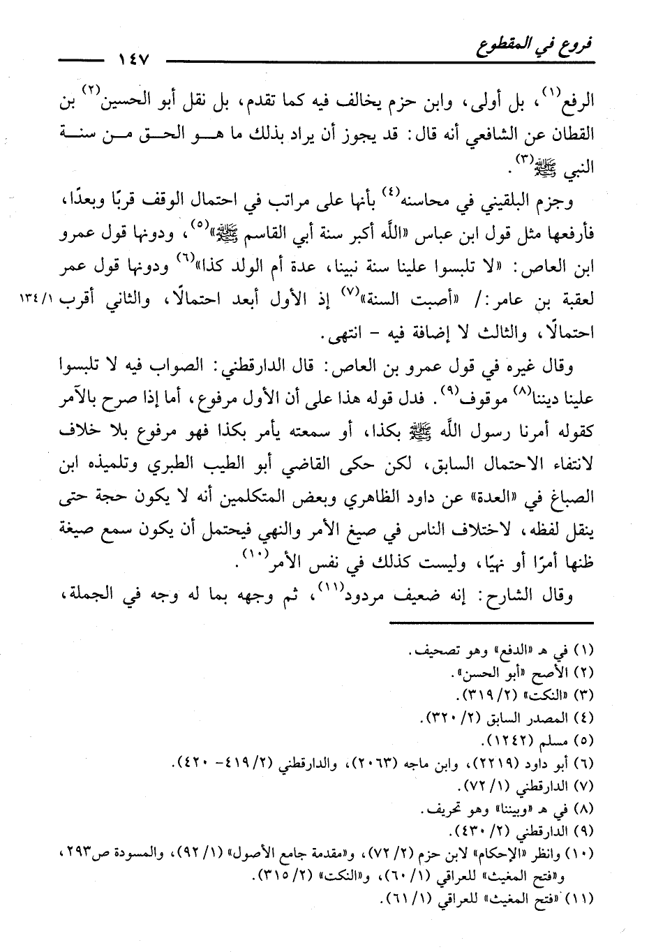 وَقَالَ غَيْرُهُ فِي قَوْلِ عَمْرِو بْنِ الْعَاصِ: قَالَ الدَّارَقُطْنِيُّ: الصَّوَابُ فِيهِ: لَا تُلَبِّسُوا عَلَيْنَا دِينَنَا. مَوْقُوفٌ ; فَدَلَّ قَوْلُهُ هَذَا عَلَى أَنَّ الْأَوَّلَ مَرْفُوعٌ، أَمَّا إِذَا صَرَّحَ بِالْآمِرِ ; كَقَوْلِهِ: أَمَرَنَا رَسُولُ اللَّهِ - صَلَّى اللَّهُ عَلَيْهِ وَسَلَّمَ - بِكَذَا، أَوْ سَمِعْتُهُ يَأْمُرُ بِكَذَا، فَهُوَ مَرْفُوعٌ بِلَا خِلَافٍ ; لِانْتِفَاءِ الِاحْتِمَالِ السَّابِقِ.