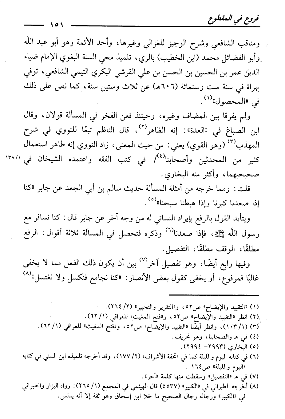 وَيَتَأَيَّدُ الْقَوْلُ بِالرَّفْعِ بِإِيرَادِ النَّسَائِيِّ لَهُ مِنْ وَجْهٍ آخَرَ عَنْ جَابِرٍ قَالَ: كُنَّا نُسَافِرُ مَعَ رَسُولِ اللَّهِ - صَلَّى اللَّهُ عَلَيْهِ وَسَلَّمَ -، فَإِذَا صَعِدْنَا. . . وَذَكَرَهُ، فَتَحَصَّلَ فِي الْمَسْأَلَةِ ثَلَاثَةُ أَقْوَالٍ: الرَّفْعُ مُطْلَقًا، الْوَقْفُ مُطْلَقًا، التَّفْصِيلُ.