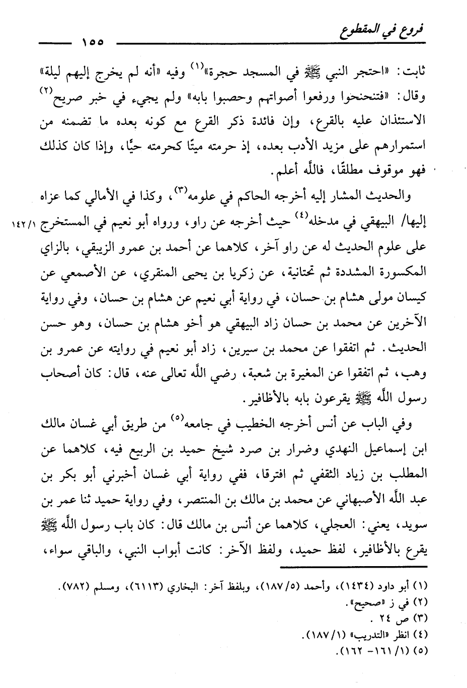 ثَابِتٍ: «احْتَجَرَ النَّبِيُّ - صَلَّى اللَّهُ عَلَيْهِ وَسَلَّمَ - فِي الْمَسْجِدِ حُجْرَةً» ، وَفِيهِ: «أَنَّهُ لَمْ يَخْرُجْ إِلَيْهِمْ لَيْلَةً» ، وَقَالَ: «فَتَنَحْنَحُوا وَرَفَعُوا أَصْوَاتَهُمْ وَحَصَبُوا بَابَهُ» ، وَلَمْ يَجِئْ فِي خَبَرٍ صَرِيحٍ الِاسْتِئْذَانُ عَلَيْهِ بِالْقَرْعِ.