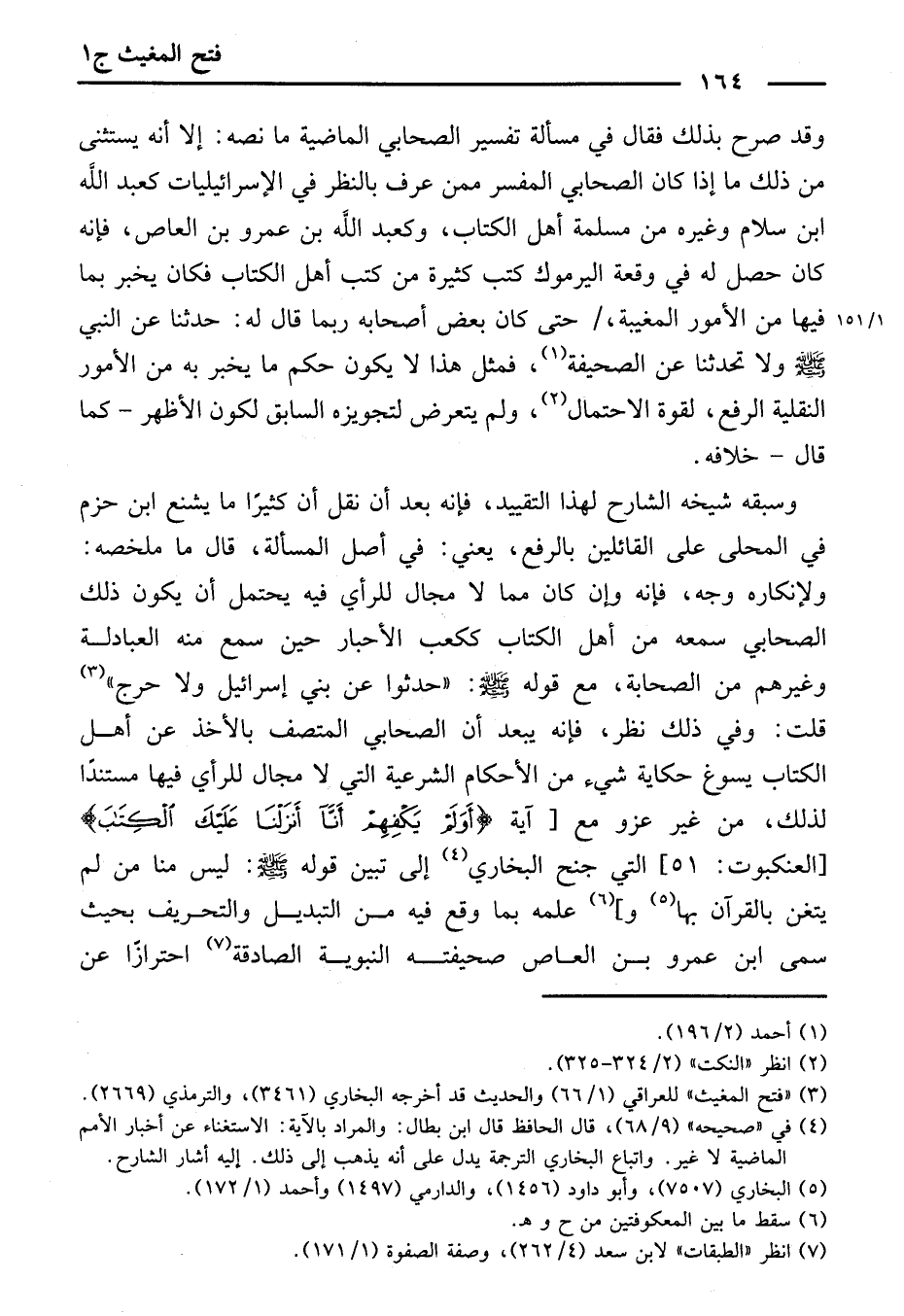 قُلْتُ: وَفِي ذَلِكَ نَظَرٌ، فَإِنَّهُ يَبْعُدُ أَنَّ الصَّحَابِيَّ الْمُتَّصِفَ بِالْأَخْذِ عَنْ أَهْلِ الْكِتَابِ يُسَوِّغُ حِكَايَةَ شَيْءٍ مِنَ الْأَحْكَامِ الشَّرْعِيَّةِ الَّتِي لَا مَجَالَ لِلرَّأْيِ فِيهَا مُسْتَنِدًا لِذَلِكَ، مِنْ غَيْرِ عَزْوٍ مَعَ [الْعَنْكَبُوتِ: 51] الَّتِي جَنَحَ الْبُخَارِيُّ إِلَى تَبْيِينِ قَوْلِهِ - صَلَّى اللَّهُ عَلَيْهِ وَسَلَّمَ -: «لَيْسَ مِنَّا مَنْ لَمْ يَتَغَنَّ بِالْقُرْآنِ» بِهَا وَ] عِلْمُهُ بِمَا وَقَعَ فِيهِ مِنَ التَّبْدِيلِ وَالتَّحْرِيفِ ; بِحَيْثُ سَمَّى ابْنُ عَمْرِو بْنِ الْعَاصِ صَحِيفَتَهُ النَّبَوِيَّةَ الصَّادِقَةَ، احْتِرَازًا عَنِ