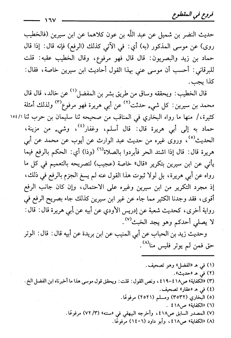 حَدِيثِ النَّضْرِ بْنِ شُمَيْلٍ عَنْ عَبْدِ اللَّهِ بْنِ عَوْنٍ، كِلَاهُمَا عَنِ ابْنِ سِيرِينَ (فَالْخَطِيبُ رَوَى) عَنْ مُوسَى الْمَذْكُورِ (بِهِ) أَيْ: فِي الْآتِي كَذَلِكَ (الرَّفْعَ) ، فَإِنَّهُ قَالَ: إِذَا قَالَ حَمَّادُ بْنُ زَيْدٍ وَالْبَصْرِيُّونَ: قَالَ: قَالَ، فَهُوَ مَرْفُوعٌ.