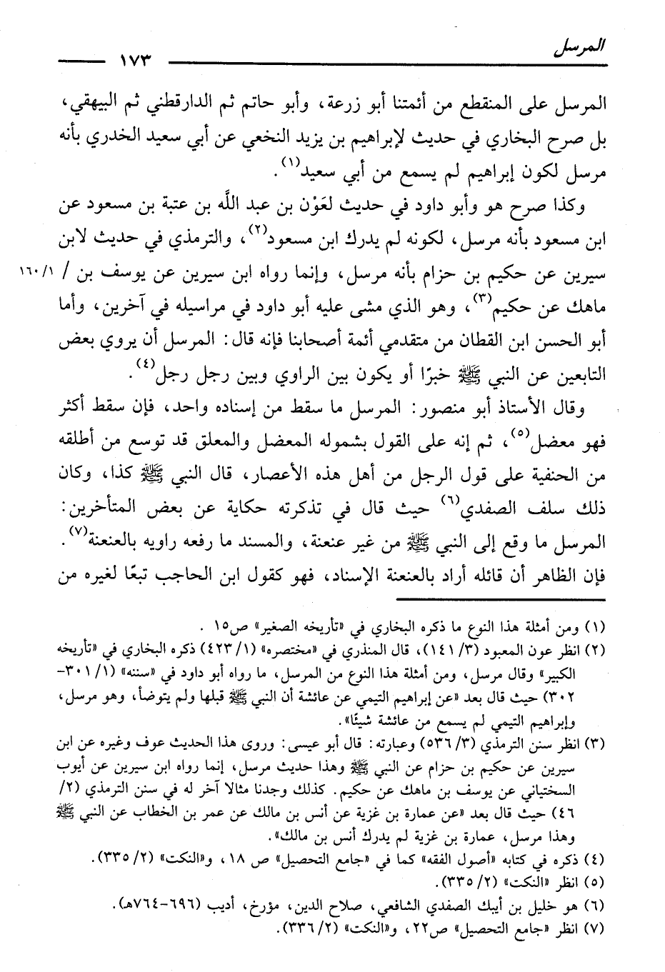 الْمُرْسَلَ عَلَى الْمُنْقَطِعِ مِنْ أَئِمَّتِنَا أَبُو زُرْعَةَ، وَأَبُو حَاتِمٍ، ثُمَّ الدَّارَقُطْنِيُّ، ثُمَّ الْبَيْهَقِيُّ، بَلْ صَرَّحَ الْبُخَارِيُّ فِي حَدِيثٍ لِإِبْرَاهِيمَ بْنِ يَزِيدَ النَّخَعِيِّ، عَنْ أَبِي سَعِيدٍ الْخُدْرِيِّ ; بِأَنَّهُ مُرْسَلٌ ; لِكَوْنِ إِبْرَاهِيمَ لَمْ يَسْمَعْ مِنْ أَبِي سَعِيدٍ.