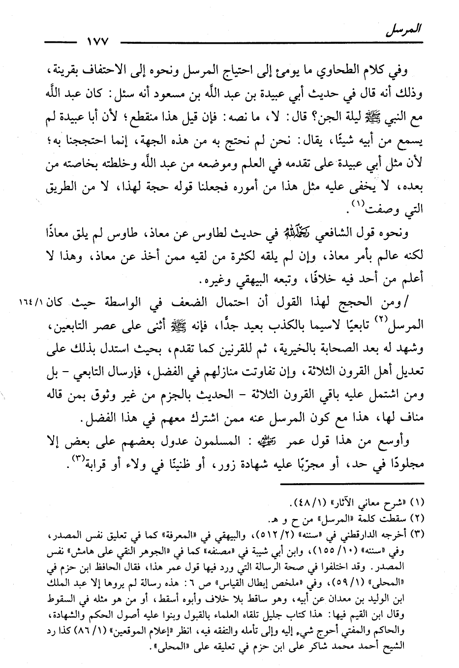 وَفِي كَلَامِ الطَّحَاوِيِّ مَا يُومِئُ إِلَى احْتِيَاجِ الْمُرْسَلِ وَنَحْوِهِ إِلَى الِاحْتِفَافِ بِقَرِينَةٍ ; وَذَلِكَ أَنَّهُ قَالَ - فِي حَدِيثِ أَبِي عُبَيْدَةَ بْنِ عَبْدِ اللَّهِ بْنِ مَسْعُودٍ أَنَّهُ سُئِلَ: كَانَ عَبْدُ اللَّهِ مَعَ النَّبِيِّ - صَلَّى اللَّهُ عَلَيْهِ وَسَلَّمَ - لَيْلَةَ الْجِنِّ؟ قَالَ: لَا - مَا نَصُّهُ: فَإِنْ قِيلَ هَذَا مُنْقَطِعٌ ; لِأَنَّ أَبَا عُبَيْدَةَ لَمْ يَسْمَعْ مِنْ أَبِيهِ شَيْئًا.