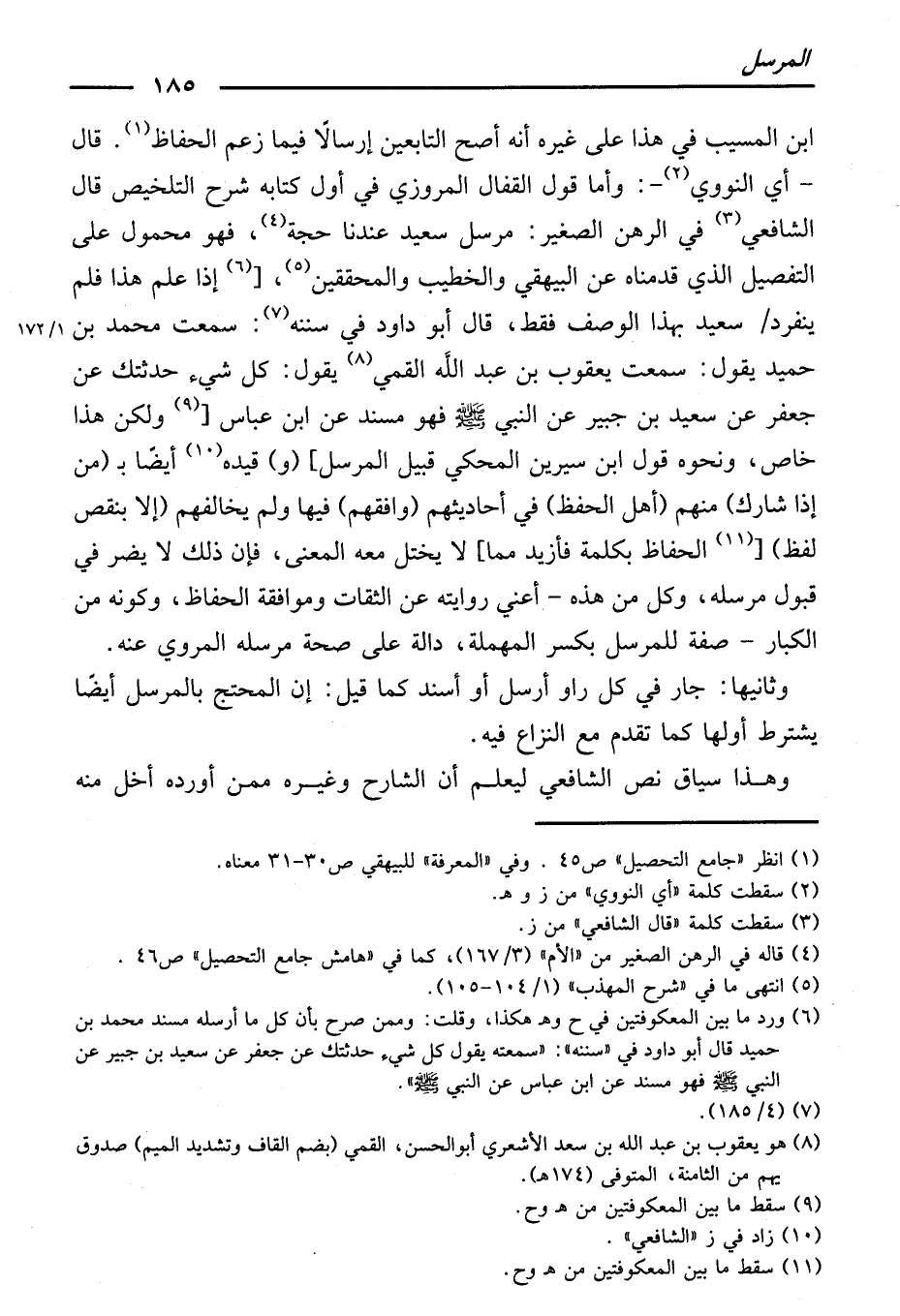 قَالَ أَيِ: النَّوَوِيُّ: وَأَمَّا قَوْلُ الْقَفَّالِ الْمَرْوَزِيِّ فِي أَوَّلِ كِتَابِهِ شَرْحِ التَّلْخِيصِ قَالَ الشَّافِعِيُّ فِي " الرَّهْنِ الصَّغِيرِ ": مُرْسَلُ سَعِيدٍ عِنْدَنَا حُجَّةٌ - فَهُوَ مَحْمُولٌ عَلَى التَّفْصِيلِ الَّذِي قَدَّمْنَاهُ عَنِ الْبَيْهَقِيِّ وَالْخَطِيبِ وَالْمُحَقِّقِينَ.