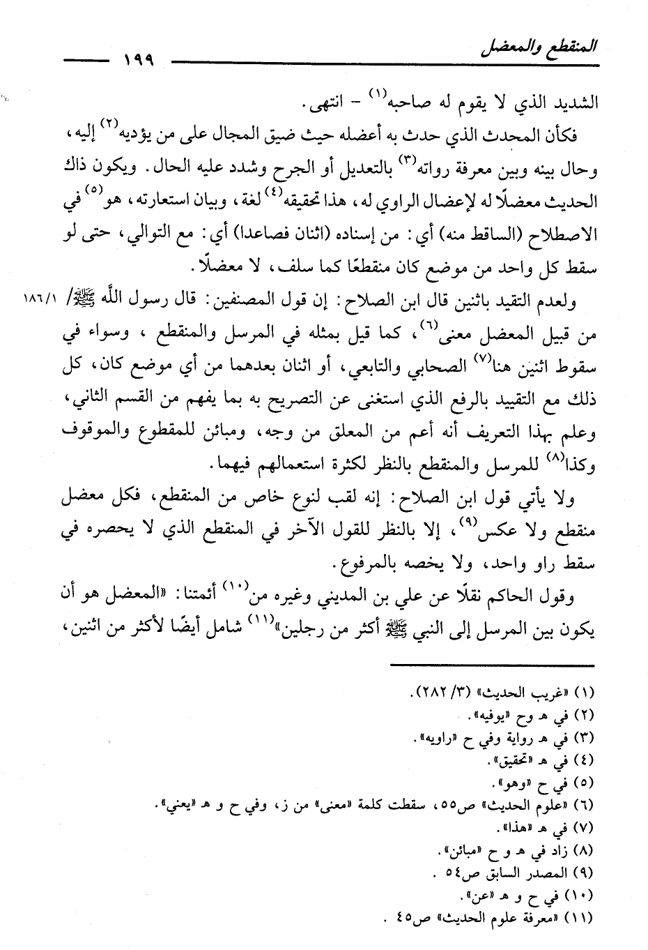 وَلِعَدَمِ التَّقَيُّدِ بِاثْنَيْنِ، قَالَ ابْنُ الصَّلَاحِ: إِنَّ قَوْلَ الْمُصَنِّفِينَ: قَالَ رَسُولُ اللَّهِ - صَلَّى اللَّهُ عَلَيْهِ وَسَلَّمَ -، مِنْ قَبِيلِ الْمُعْضَلِ مَعْنًى، كَمَا قِيلَ بِمِثْلِهِ فِي الْمُرْسَلِ وَالْمُنْقَطِعِ، وَسَوَاءٌ فِي سُقُوطِ اثْنَيْنِ هُنَا الصَّحَابِيِّ وَالتَّابِعِيِّ، أَوِ اثْنَانِ بَعْدَهُمَا مِنْ أَيِّ مَوْضِعٍ كَانَ، كُلُّ ذَلِكَ مَعَ التَّقْيِيدِ بِالرَّفْعِ الَّذِي اسْتَغْنَى عَنِ التَّصْرِيحِ بِهِ بِمَا يُفْهَمُ مِنَ الْقِسْمِ الثَّانِي.