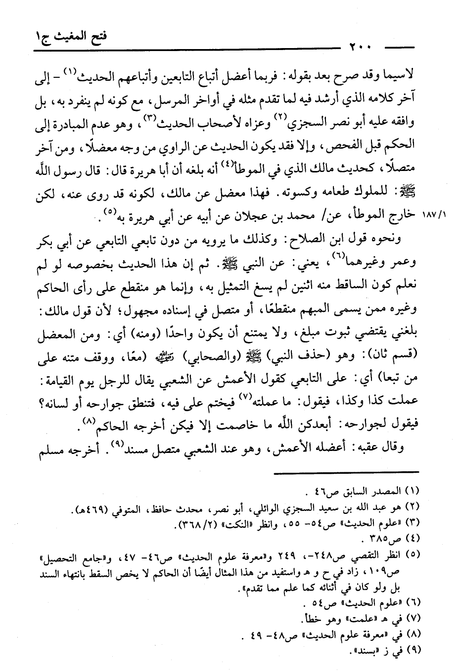 لَا سِيَّمَا وَقَدْ صَرَّحَ بَعْدُ بِقَوْلِهِ: فَرُبَّمَا أَعْضَلَ أَتْبَاعُ التَّابِعِينَ وَأَتْبَاعُهُمُ. . . الْحَدِيثَ - إِلَى آخِرِ كَلَامِهِ الَّذِي أَرْشَدَ فِيهِ لِمَا تَقَدَّمَ مِثْلُهُ فِي أَوَاخِرِ الْمُرْسَلِ، مَعَ كَوْنِهِ لَمْ يَنْفَرِدْ بِهِ، بَلْ وَافَقَهُ عَلَيْهِ أَبُو نَصْرٍ السِّجْزِيُّ، وَعَزَاهُ لِأَصْحَابِ الْحَدِيثِ.