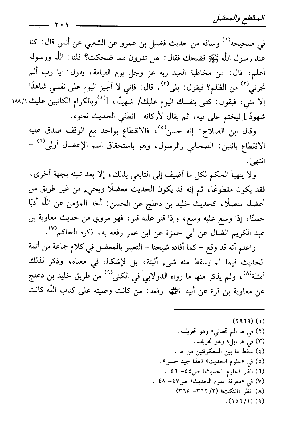 وَلَا يَتَهَيَّأُ الْحُكْمُ لِكُلِّ مَا أُضِيفَ إِلَى التَّابِعِيِّ بِذَلِكَ، إِلَّا بَعْدَ تَبَيُّنِهِ بِجِهَةٍ أُخْرَى، فَقَدْ يَكُونُ مَقْطُوعًا، ثُمَّ إِنَّهُ قَدْ يَكُونُ الْحَدِيثُ مُعْضَلًا، وَيَجِيءُ مِنْ غَيْرِ طَرِيقِ مَنْ أَعْضَلَهُ مُتَّصِلًا ; كَحَدِيثِ خُلَيْدِ بْنِ دَعْلَجٍ عَنِ الْحَسَنِ: " أَخَذَ الْمُؤْمِنُ عَنِ اللَّهِ أَدَبًا حَسَنًا، إِذَا وُسِّعَ عَلَيْهِ وَسَّعَ، وَإِذَا قُتِّرَ عَلَيْهِ قَتَّرَ " فَهُوَ مَرْوِيٌّ مِنْ حَدِيثِ مُعَاوِيَةَ بْنِ عَبْدِ الْكَرِيمِ الضَّالِّ، عَنْ أَبِي حَمْزَةَ، عَنِ ابْنِ عُمَرَ رَفَعَهُ بِهِ. ذَكَرَهُ الْحَاكِمُ.
