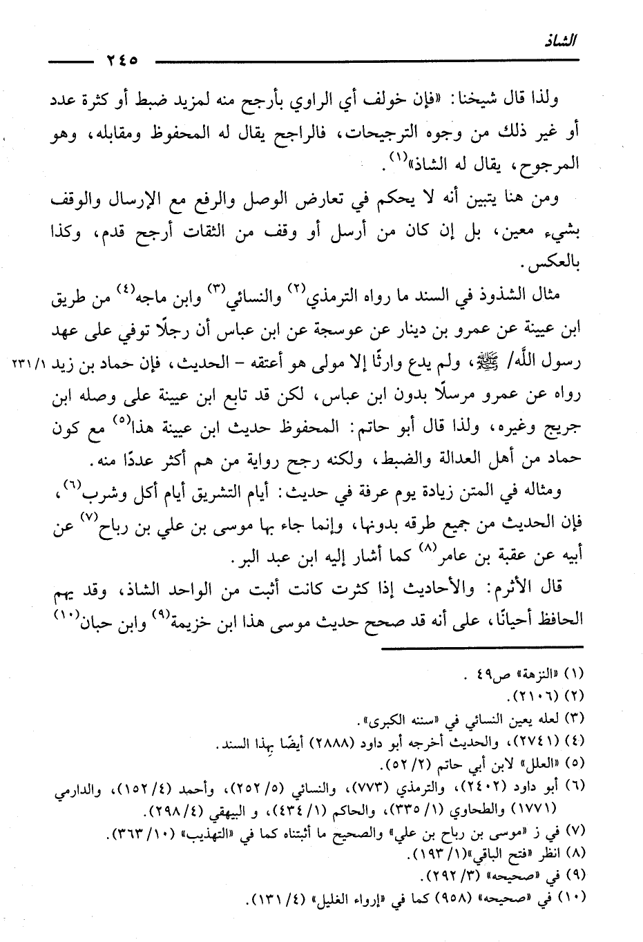 وَلِذَا قَالَ شَيْخُنَا: (فَإِنْ خُولِفَ - أَيِ: الرَّاوِي - بِأَرْجَحَ مِنْهُ لِمَزِيدِ ضَبْطٍ أَوْ كَثْرَةِ عَدَدٍ أَوْ غَيْرِ ذَلِكَ مِنْ وُجُوهِ التَّرْجِيحَاتِ - فَالرَّاجِحُ يُقَالُ لَهُ: الْمَحْفُوظُ، وَمُقَابِلُهُ وَهُوَ الْمَرْجُوحُ، يُقَالُ لَهُ: الشَّاذُّ) .